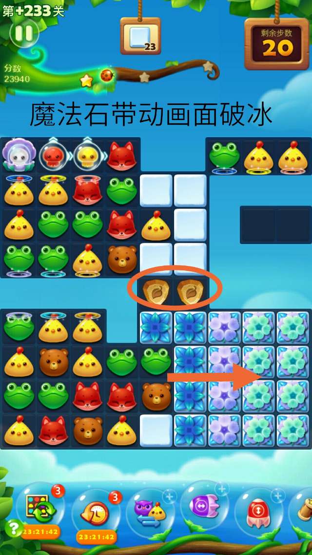 【连续消除】:连续消除得分:一般消除一下30分,连消每次+30,60、90、120依次叠加;冰块里面消除一次1000,连消一次+1000,2000、3000、4000依次叠加;5+4组合一下给2000,每个被变化动物200分,每打掉一个普通的动物15分,冰块1500。