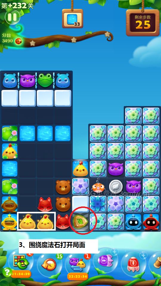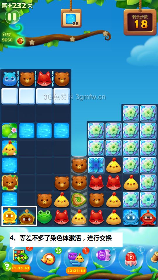 此开局法并不是标准解法(标准解法是3步激活棕黄染色体并交换,详见其他人的帖子),但此开局法另辟蹊径,2步激活魔法石,并且顺带消除冰块打开局面,个人认为过关效率比较高(本人稀里糊涂没前置+3也过关了)。