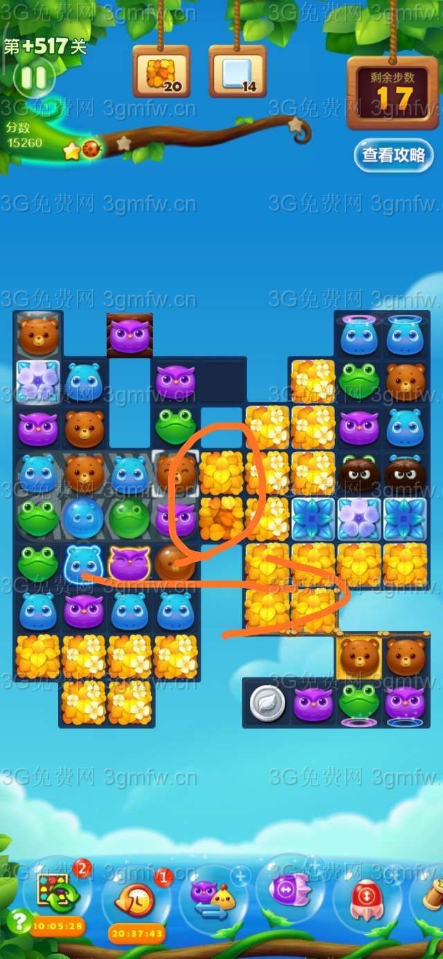 开心消消乐精英关517关怎么打?开心消消乐是消除Q萌可爱的小动物们,将三个及以上相同颜色的小动物连成一条直线即可消除,老少皆宜!不会闯关的玩家快来看看G7小编带来的第精英关517关攻略吧!