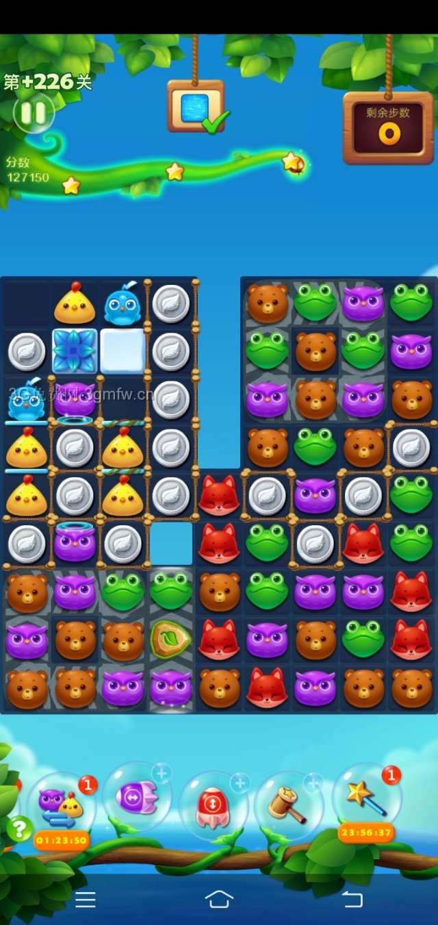开局加三,固定俩河马互换,然后别急着换河马和小鸡,否则死局;打蜂蜜瓶子,让蜂蜜堵住左上小鸡,河马宝宝和小鸡互换,左下填满小动物,剩下主打魔法石,能组45最佳(右面俩犄角有难度)。