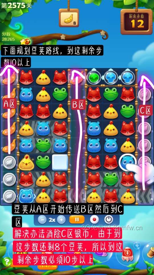 后期消除右边银币即可收集,到收集豆荚步数必须10步以上,要注意传送带节奏。
