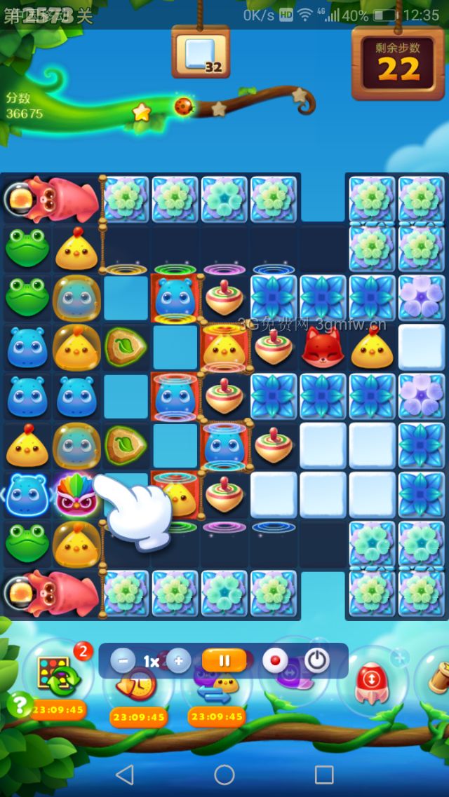 这关步数浪费非常严重,很难进行,开局激活魔法石,利用魔法石攻击蜂蜜罐,收集蜂蜜,送章鱼回家,然后可以消除陀螺,陀螺消除很难,然后打开区域,右侧上方的冰层是限制因素,多组竖直特效消除,前期一定要节省步数,祝福好运。