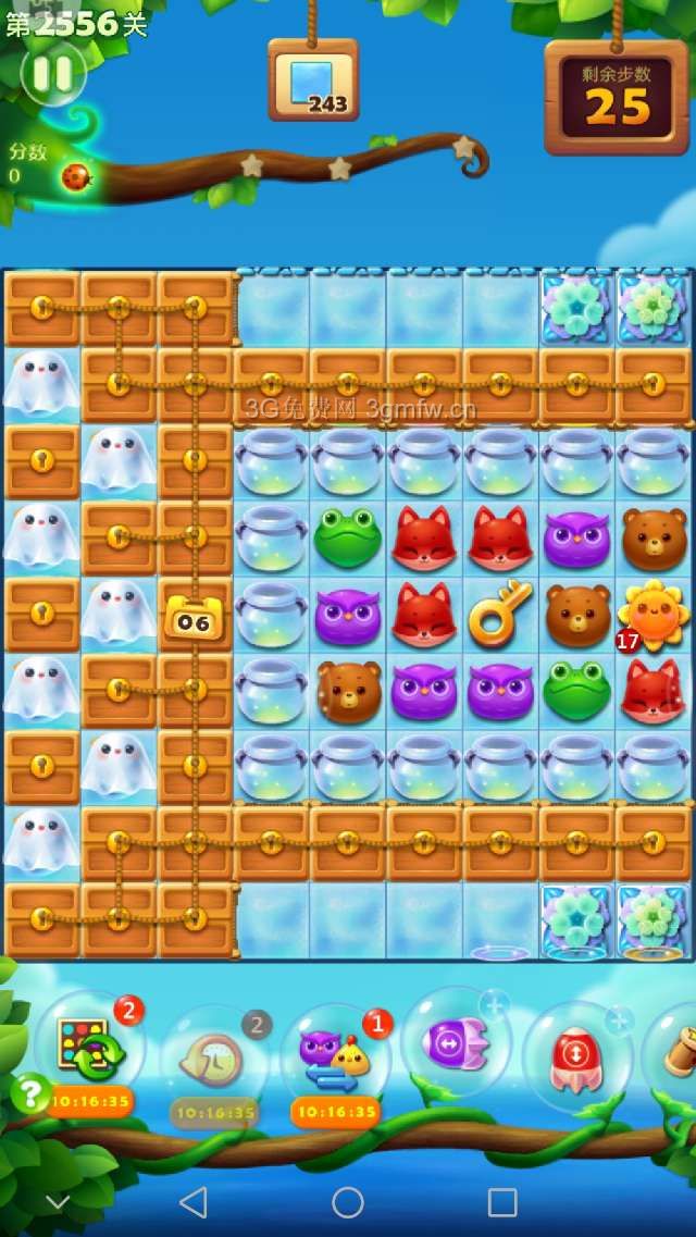 三消紫咪收,主打右边消开宝箱,让幽灵往上飞。在左边消魔法水。到右边消魔法瓶消太阳瓶,让太阳花清屏一次,组鸟十双鸟!余一步三星了!