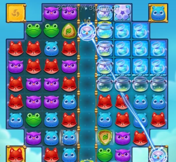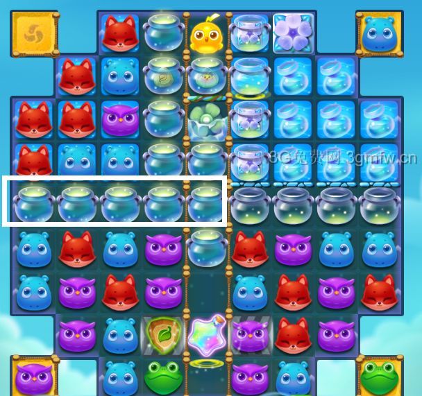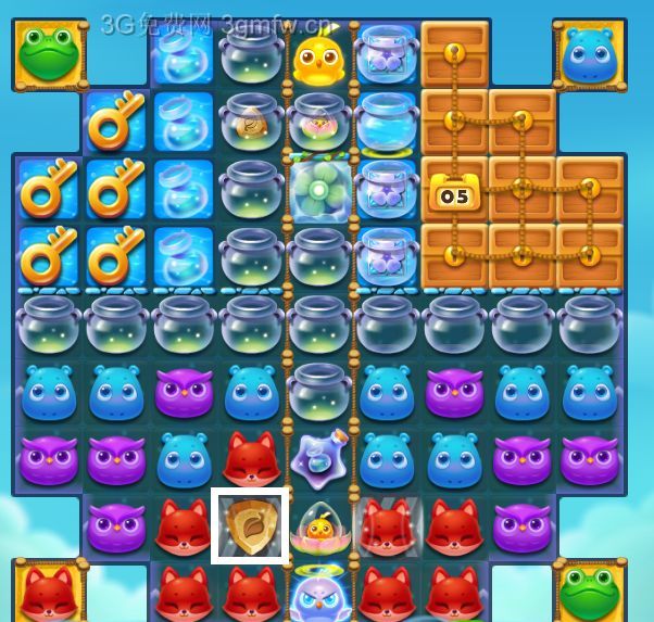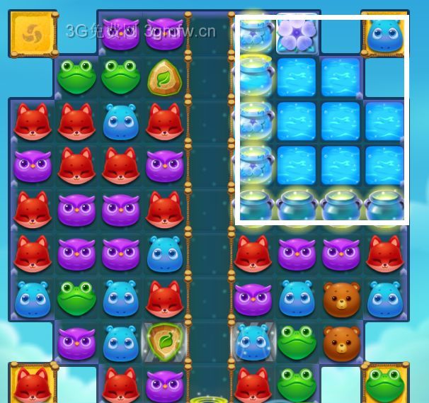 ④击碎右侧魔法罐,利用掉落的小动物优先消除雪块,消除过程中适当控制荷塘蔓延的趋势。最后收尾荷塘即可。