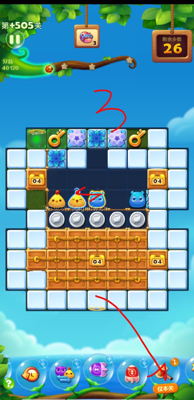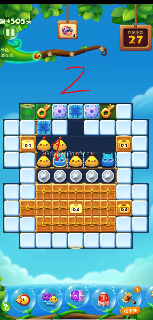 第一只蜗牛要尽早放出来是关键,几步后尽量腾出空间让第二只出来,两只出来后第三只就快了,我是加3步开局,剩11步已经3只都齐了,又打一局没加3剩8步出的第三只,最后剩一步过关,左上的魔法石要想办法激活。如果局面好的话锤子能留到最后。