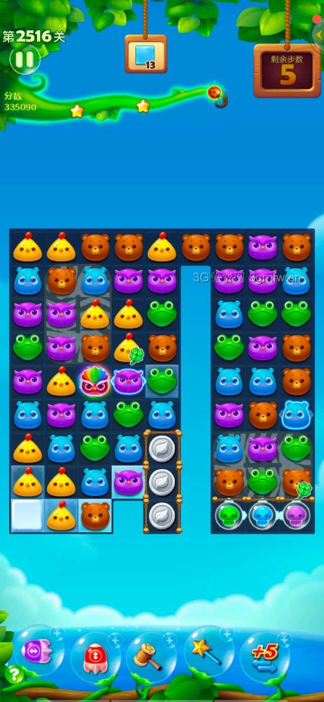 稳中求胜,这关没打几次就过了,需要极好的耐心,因为我已经没任何道具跟银币了,剩余5步时,没有急于求成用掉54,而是消小鸡让猫头鹰掉下来,赌运气,54没掉下来,最后还来了个横扫青蛙,缺一不可,老套路,组54,加左边横扫竖射爆炸。