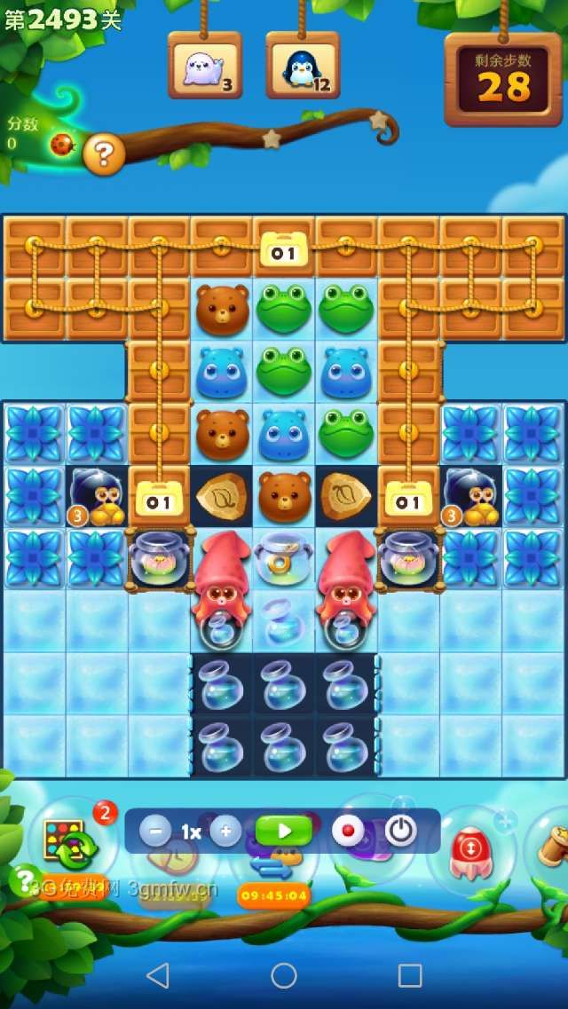 本关前置+3。开局激活魔法石,魔法石激活螃蟹,螃蟹激活将雪块消除,小动物填充下面空隙。通过三消将魔法瓶消除一些,激活墨鱼。再次消除剩余魔法瓶,将魔法罐激活。打爆罐子,释放钥匙。收集钥匙,打开上部空间。通过三消或特效将上部雪块消除。组织鸟+特效将冰块消除,动物就无意中收集完了。