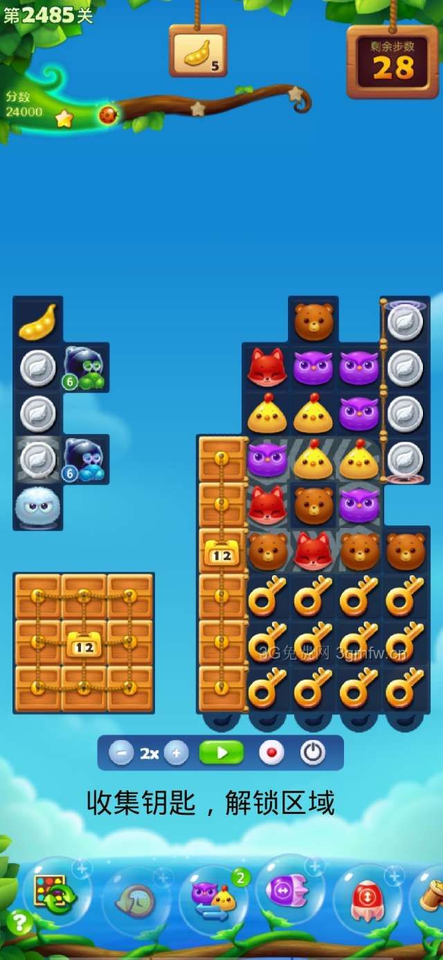 开局快速收集钥匙,解锁宝盒区域,然后消除中间冰层,左下角收集蓝色动物,激活螃蟹,消除毛球,让豆荚掉落,然后消除中间金币,收集豆荚,只要好好利用,过关还算容易,祝福好运。