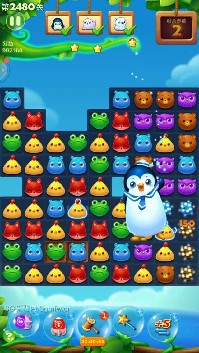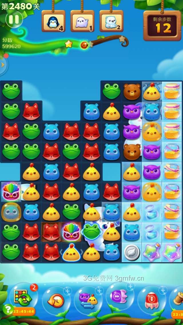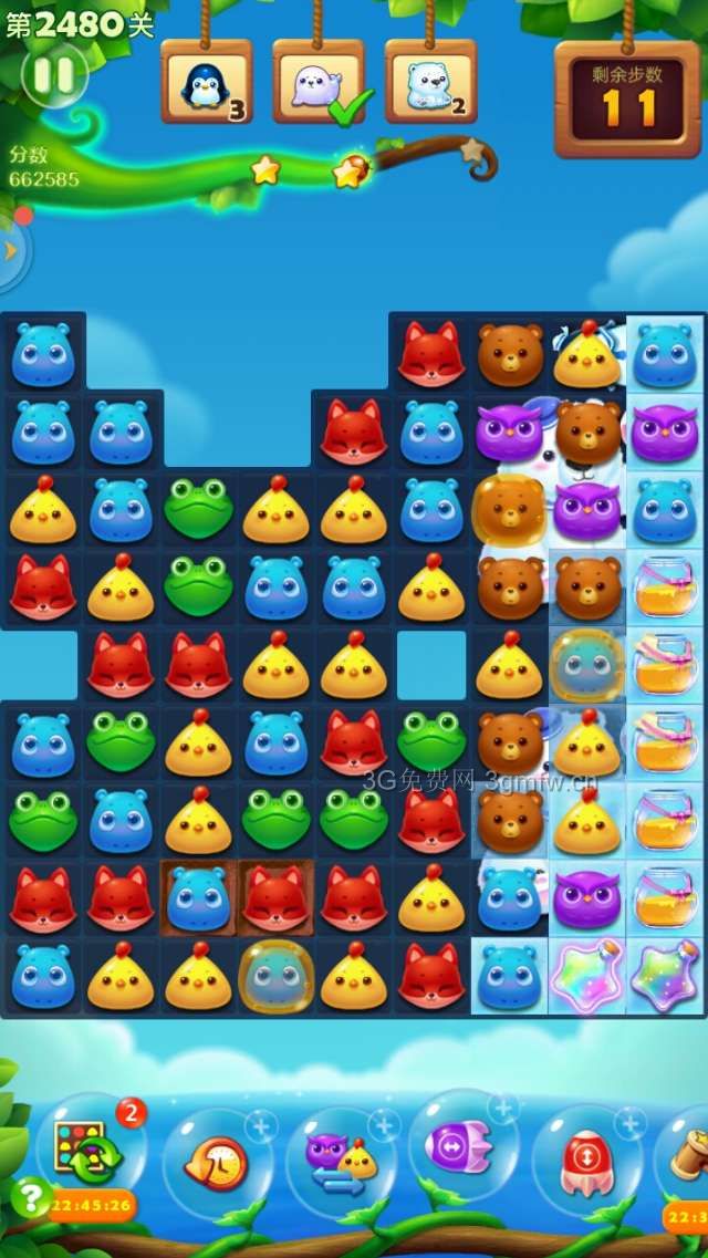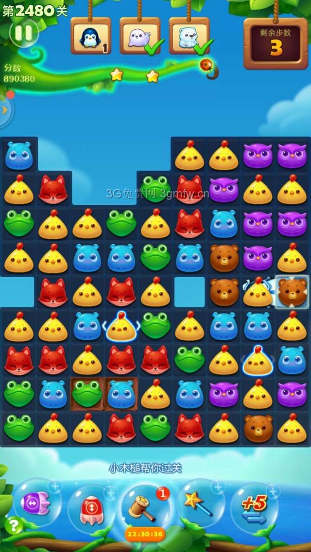 开心消消乐2480关卡玩了很多次都不过关,右边的雪块太难消除完,银币不允许再买+3步。发现了一个相对容易出现魔力鸟和各种特效的技巧。左上角红狐狸和蓝河马互换位置消除雪块,然后从缺口往下消除雪块,打破两块封印石。这时很可能组成了鸟加特效,不过看个人的组成技术与运气。右下角两只精力瓶发亮后互换清屏消除。从右上角组竖直向下特效和爆炸特效互换,左下角组横向特效和爆炸特效互换。会出现自动连消。不买+3步,过关了还剩下两步。
