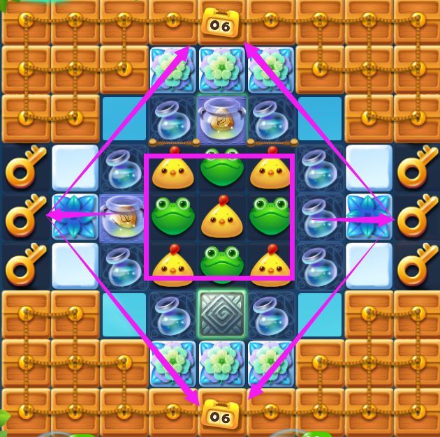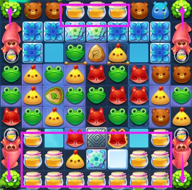 3.蜂蜜罐释放的蜂蜜可能对消除雪块有所阻碍,所以建议小伙伴们优先清除雪块后击碎蜂蜜罐。【中间区域面积大,易合成特效哦~】