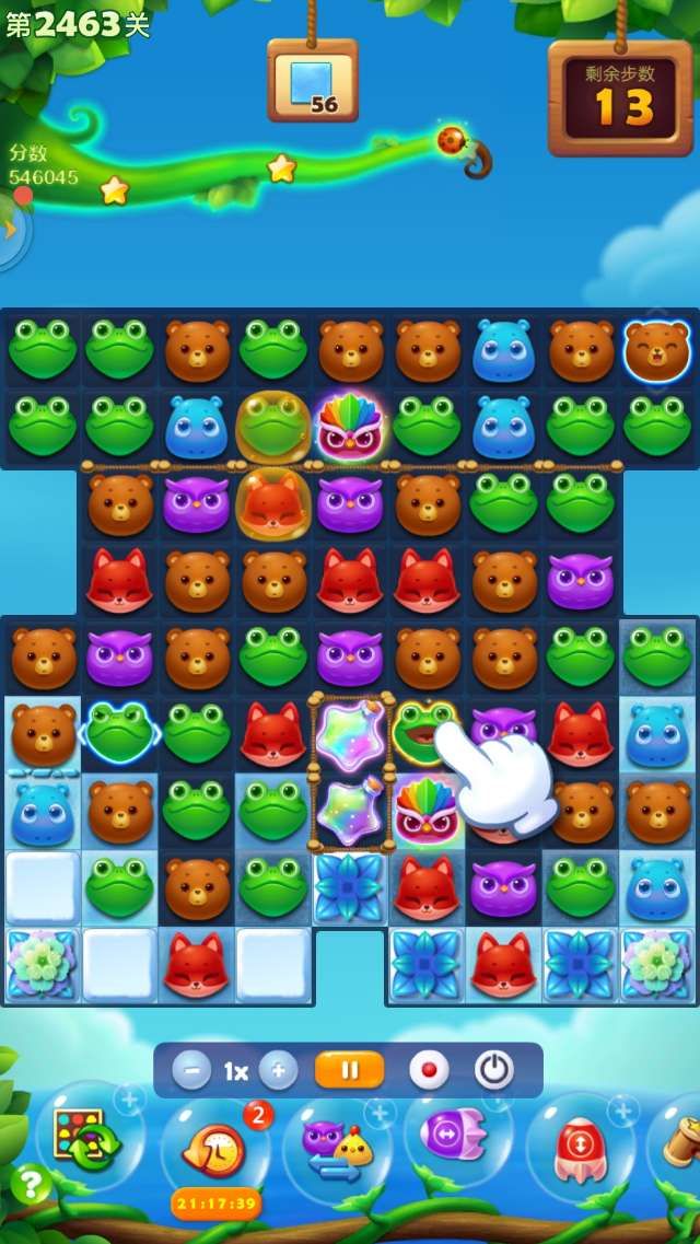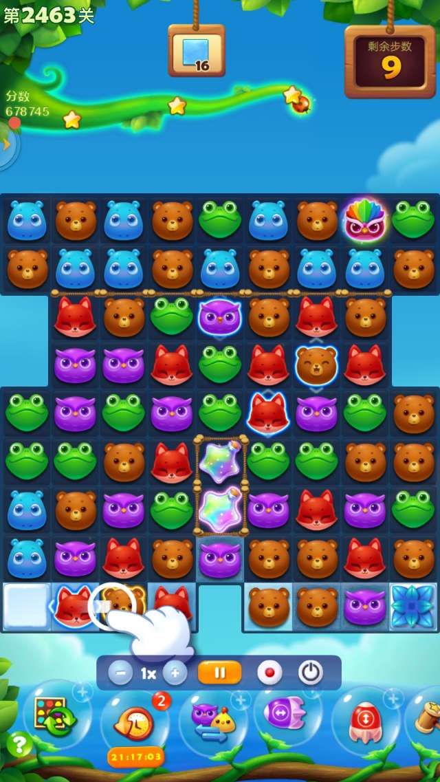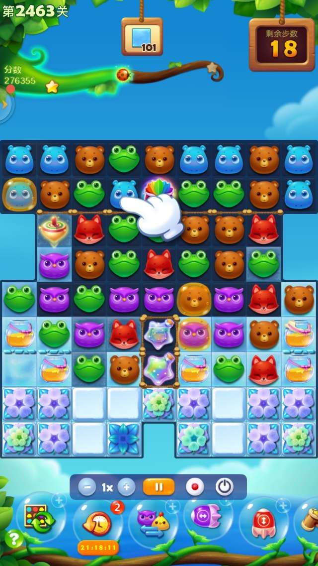 1 三消收集钥匙,然后收集部分陀螺,一路向下,上面动物种类较少,容易组成魔力鸟和特效,然后狂轰乱炸,消除下方冰块及蜂蜜罐。