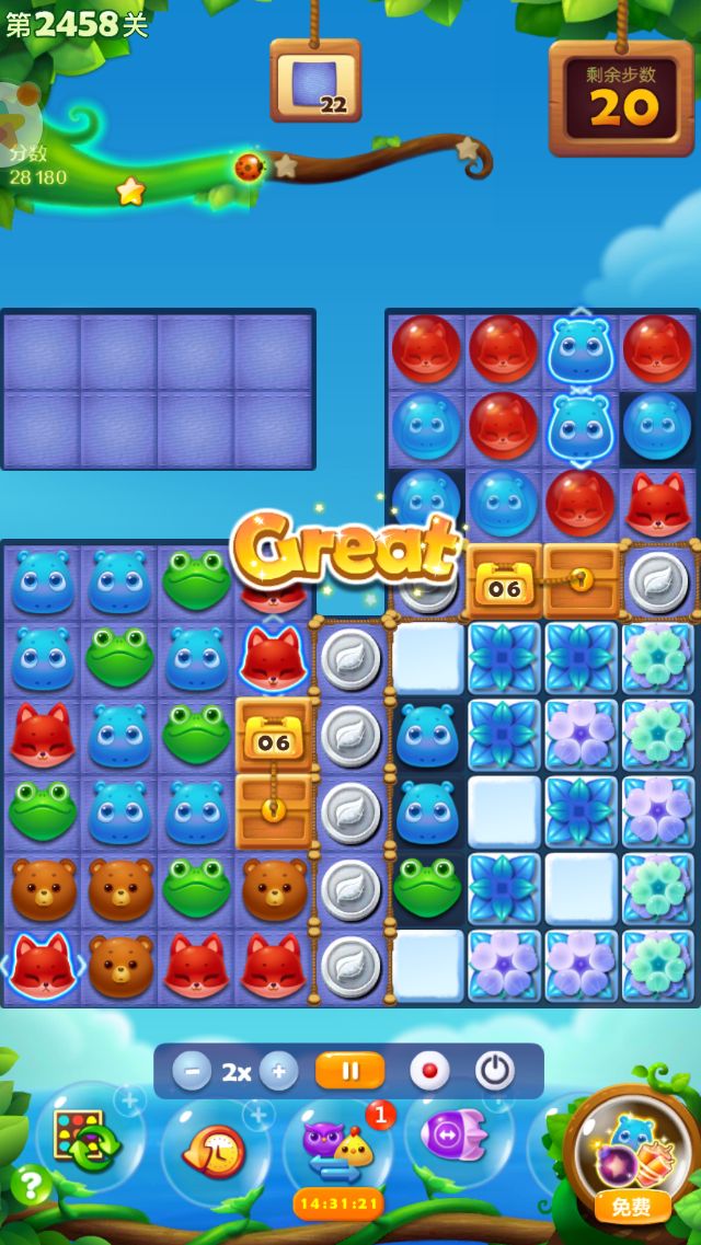 【连续消除】:连续消除得分:一般消除一下30分,连消每次+30,60、90、120依次叠加;冰块里面消除一次1000,连消一次+1000,2000、3000、4000依次叠加;5+4组合一下给2000,每个被变化动物200分,每打掉一个普通的动物15分,冰块1500。