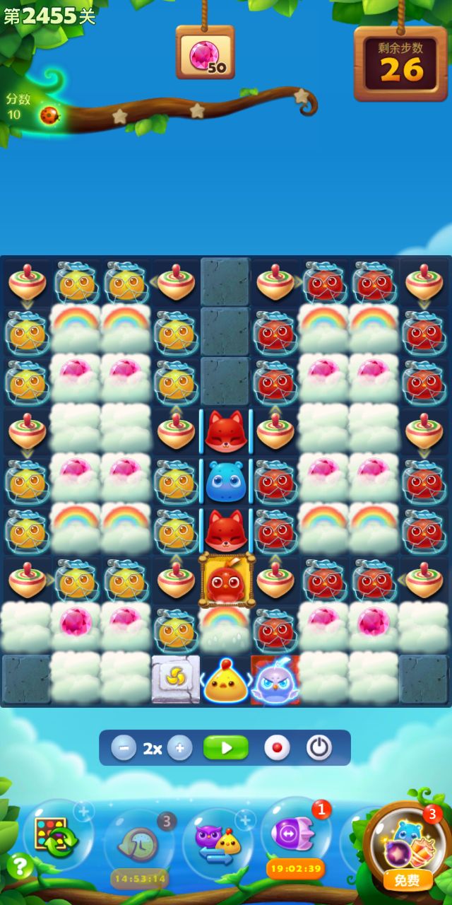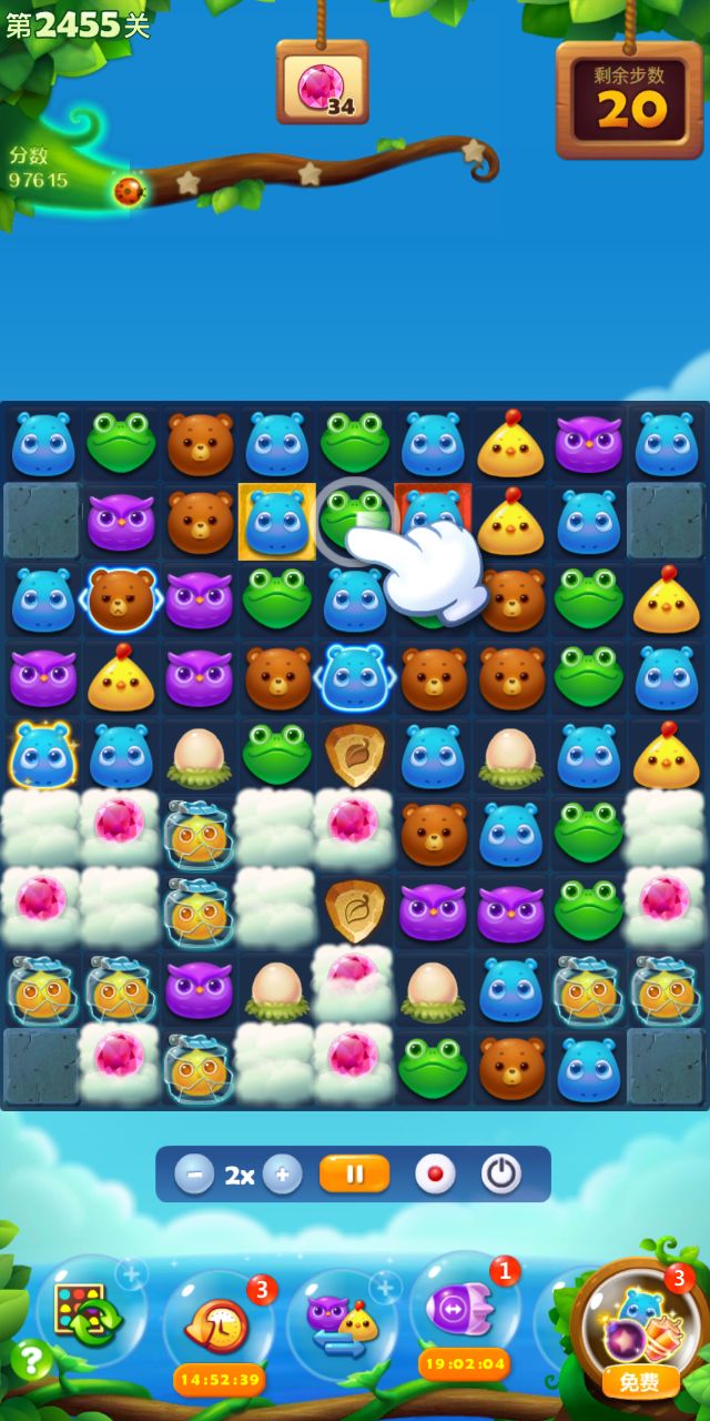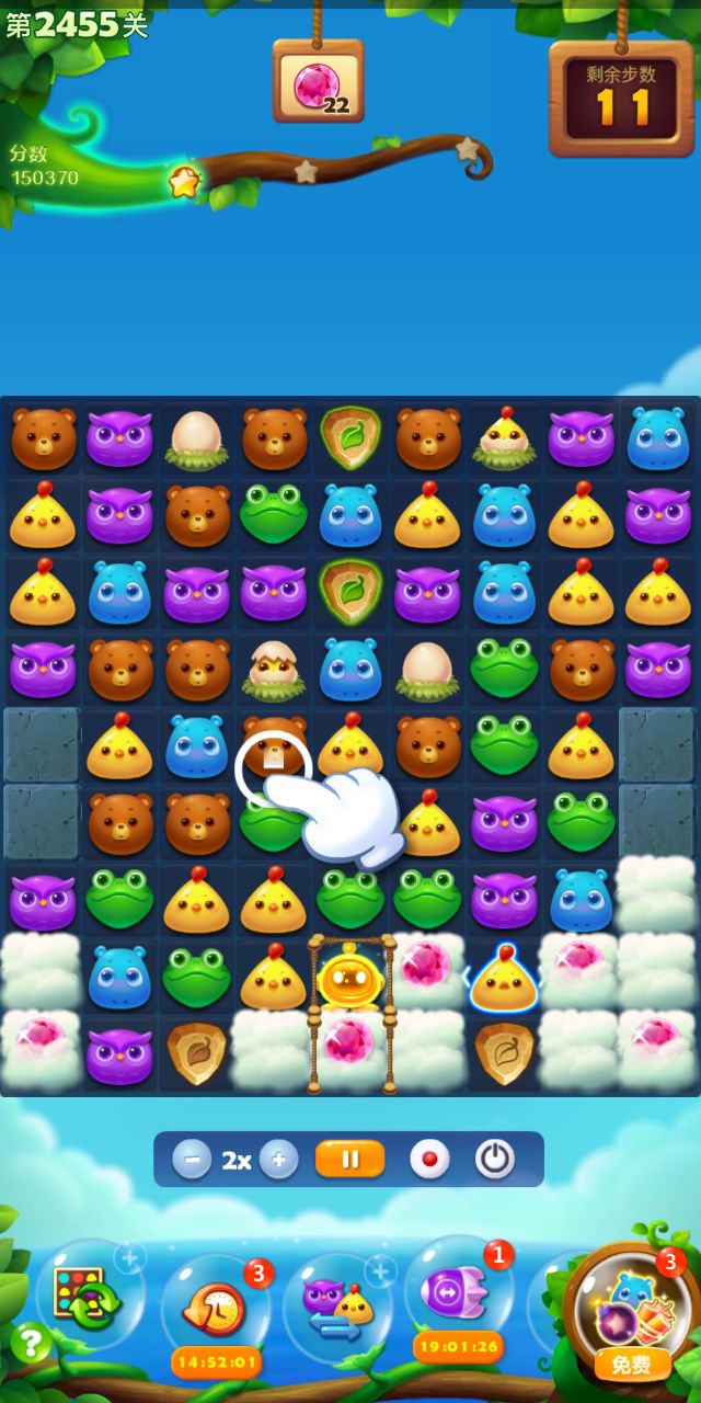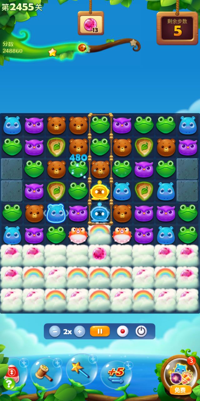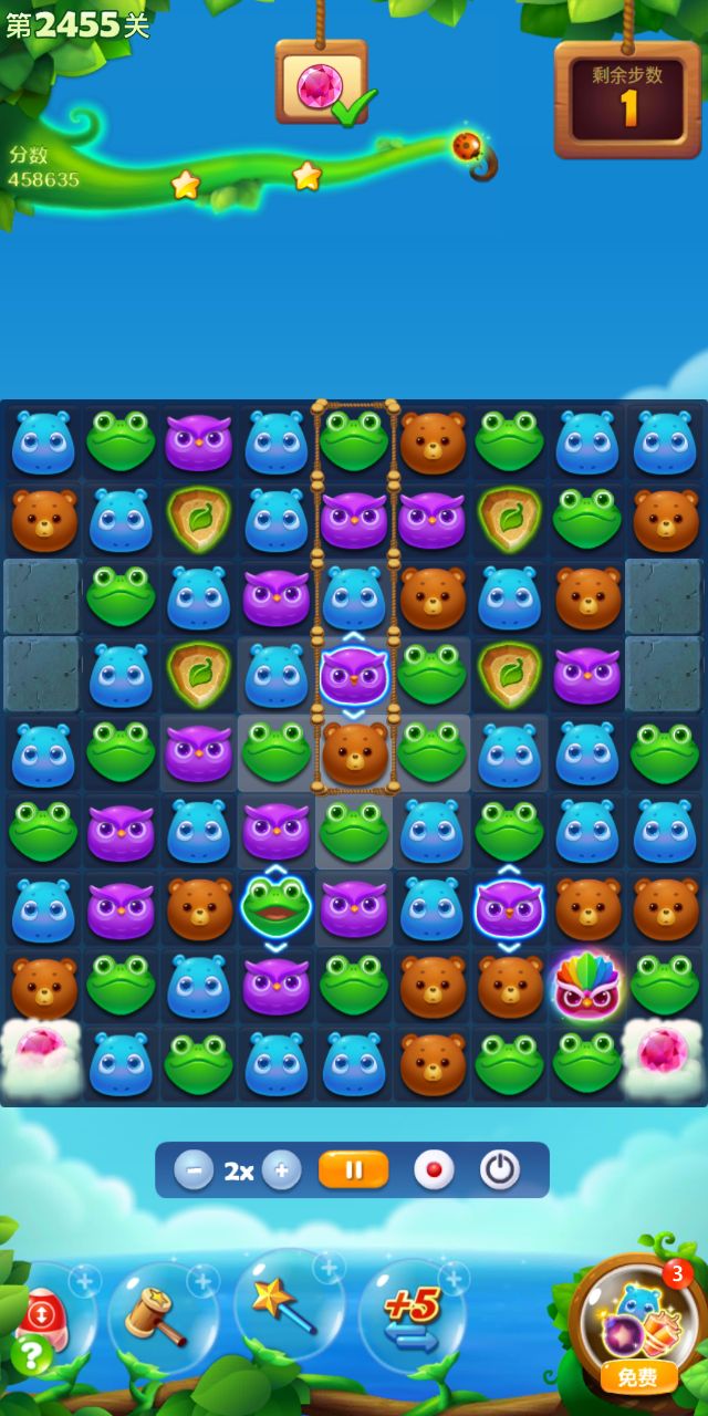 宝石关,难度系数小,但步数紧张。下推多用特效,节省步数。两染色宝宝的汇合,有些麻烦,多打魔法石。