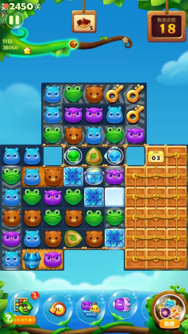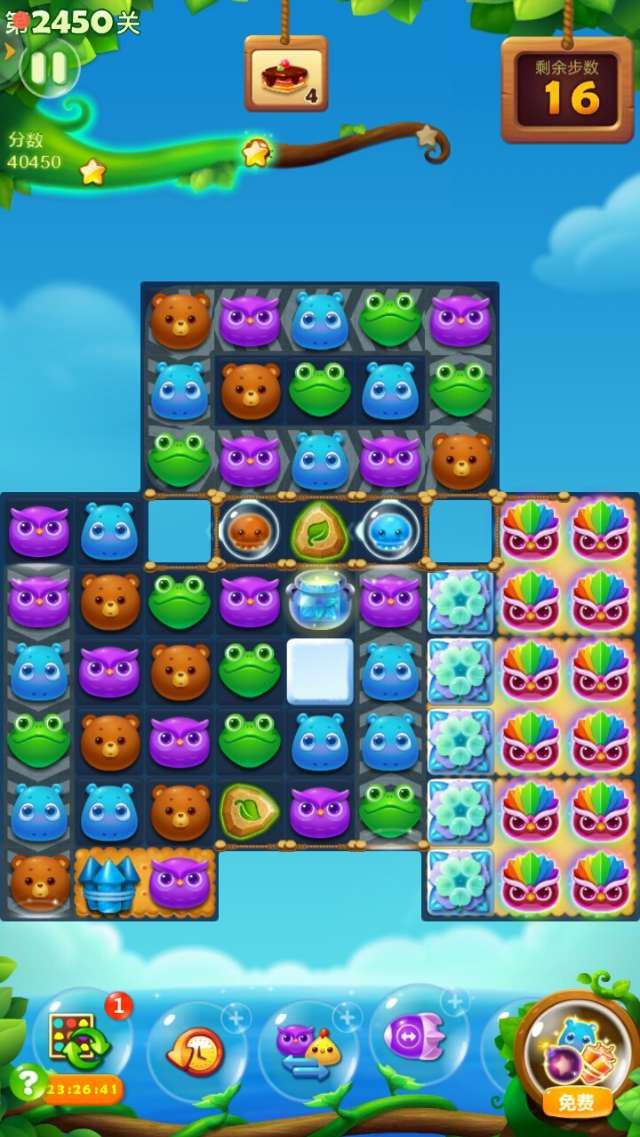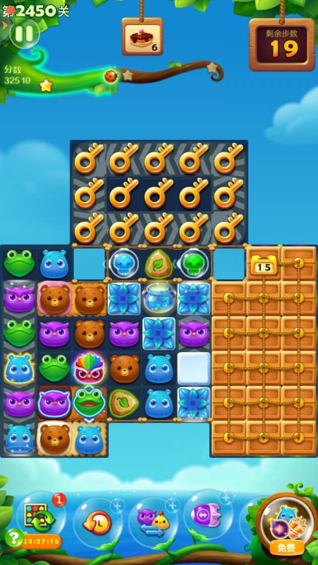 买+3步,限时导弹特效点上,其它道具不买了。开始打爆贝壳出水母,尽快激发钥匙花苞,散开钥匙在顶部。这关左边的蛋糕很容易收集到,消除完钥匙,右边出现很多魔力鸟。建议互换右下角最底部的两只魔力鸟,这样好像清屏消除时自动连消多一些。在右边组爆炸特效和爆炸特效互换,蛋糕体很快变成棕色,横向特效和爆炸特效互换,组成魔力鸟和爆炸特效互换更好。过关了剩下几步。