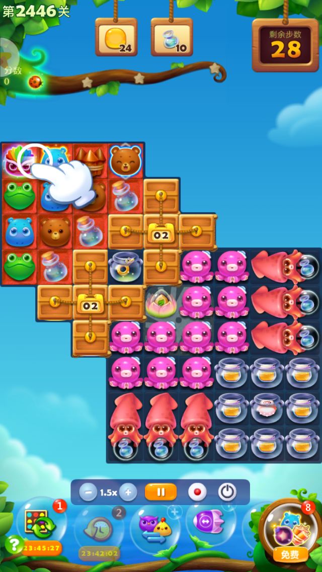 前置全上,先交换特效,点亮墨鱼,消除毒液鸟,打开局面,利用魔法石,收集钥匙。打开局面,收集水晶瓶,点亮金瓶,完成一个任务,释放蜂蜜罐,收集蜂蜜,余一步,两颗星过关!尾一步利用道具完成。