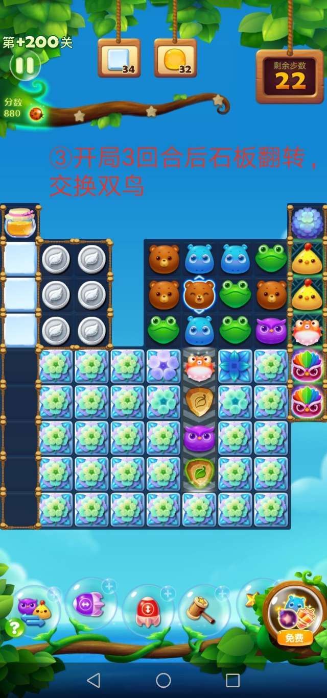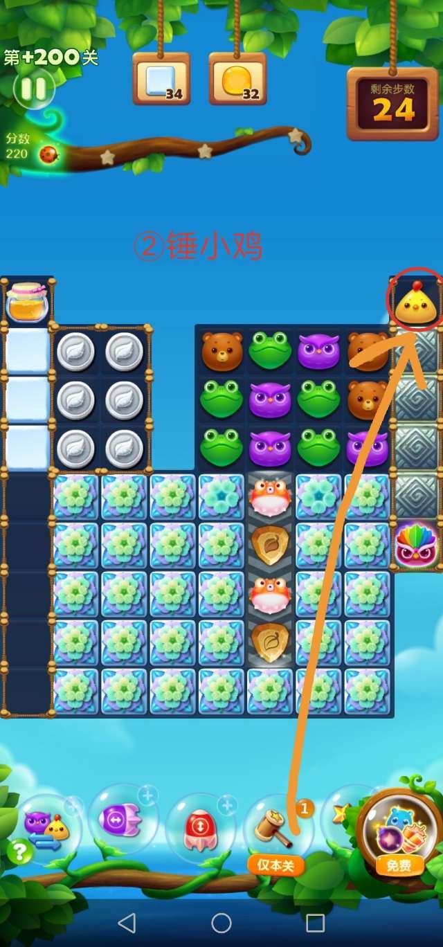 第一步拿锤子,第二步敲打右上角黄色小鸡,弟三步随机等石板翻转,第四步双鸟清屏,后面自由发挥轻松三星。