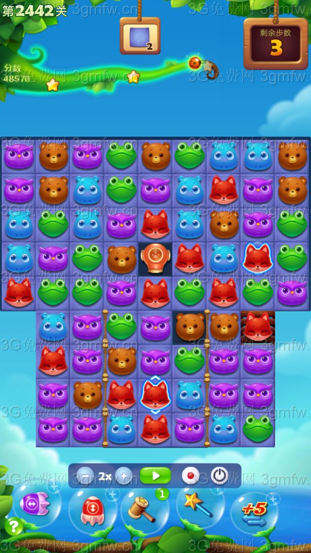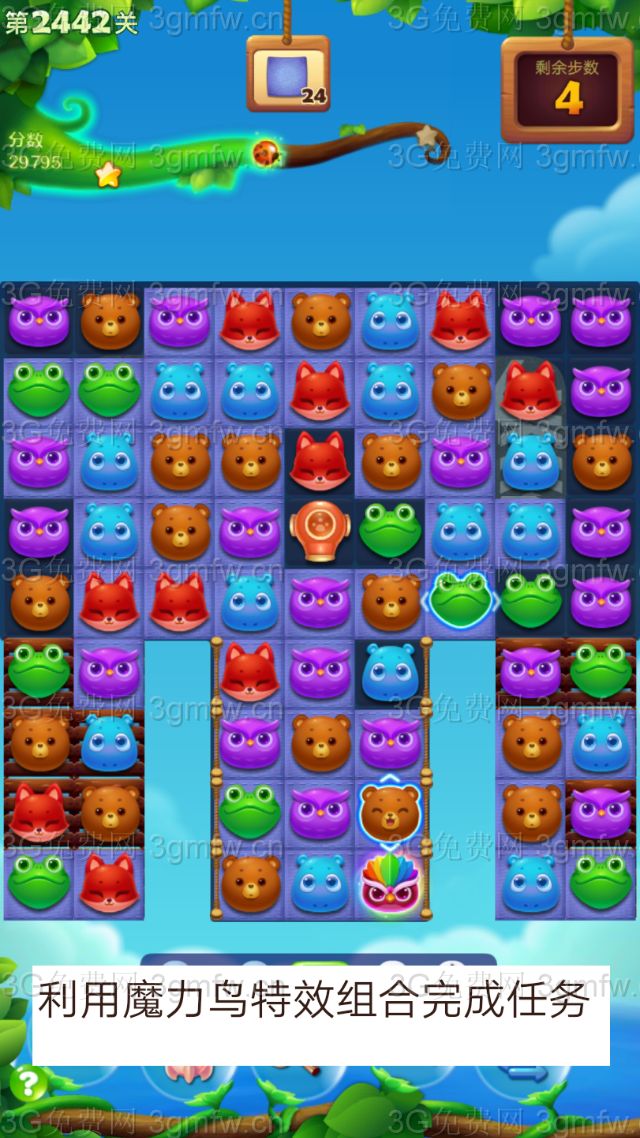 开心消消乐第2442关怎么打?开心消消乐是消除Q萌可爱的小动物们,将三个及以上相同颜色的小动物连成一条直线即可消除,老少皆宜!不会闯关的玩家快来看看G7小编带来的第2442关攻略吧!