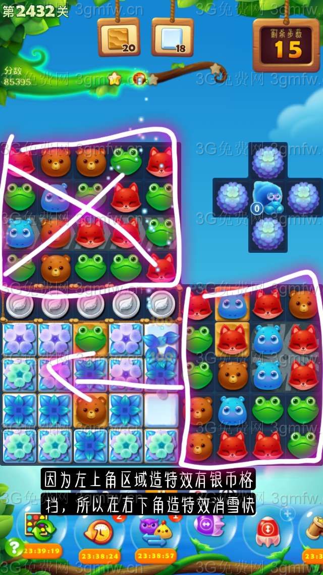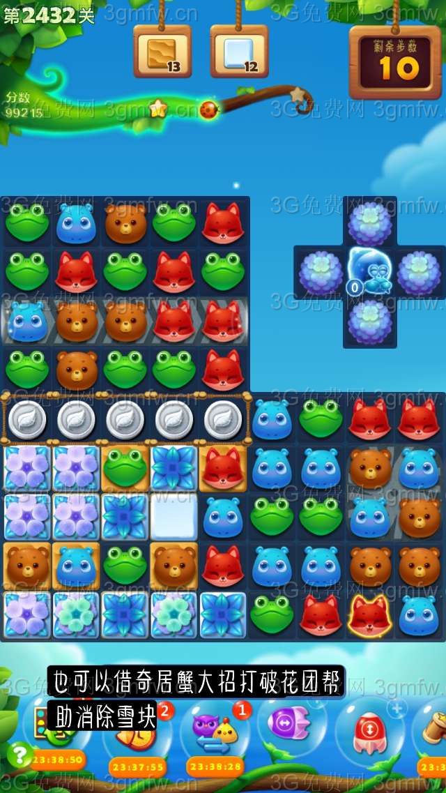 本关三星分数14万5,重点注意两点,一 开局尽量在左上角组爆炸特效,这样爆银币的同时可以带动动物掉下来的时候,三消银币尽快激活,二 不要放过在右下角组横向特效的机会,如果可以配合爆炸特效一起,左下角雪块很好消除,因为雪块不算厚,不要特地去三消蓝色激活右上角寄居蟹,除非右下角没有其它动的时候,因为配合花团很好过的。