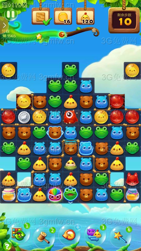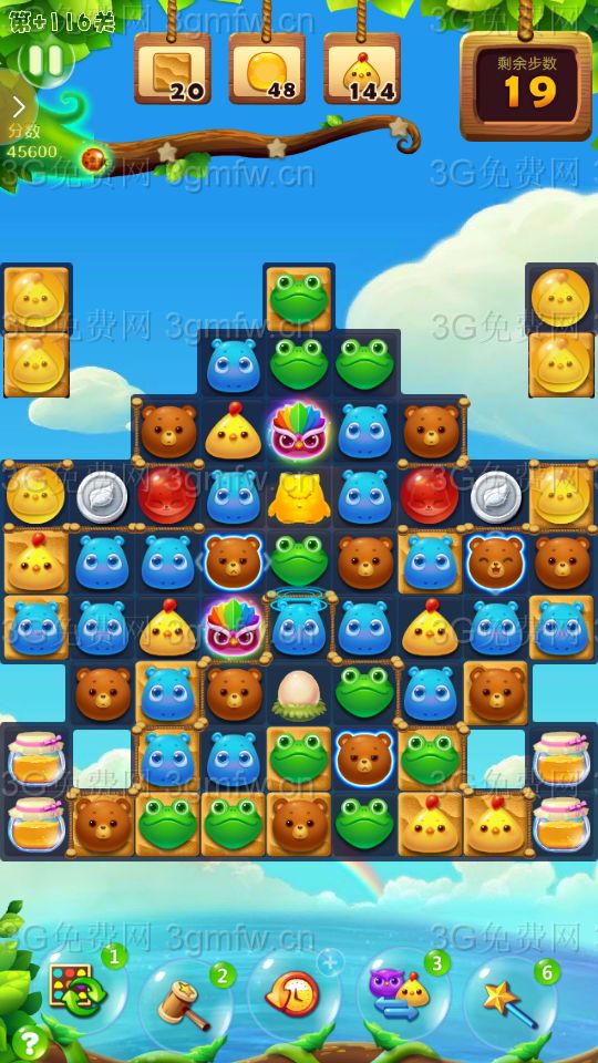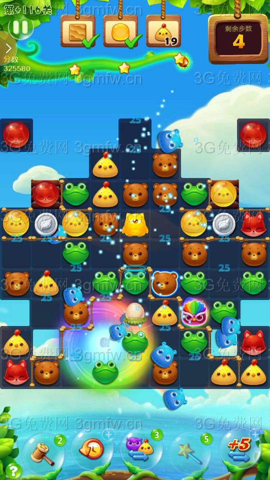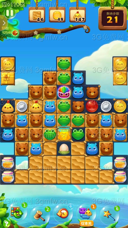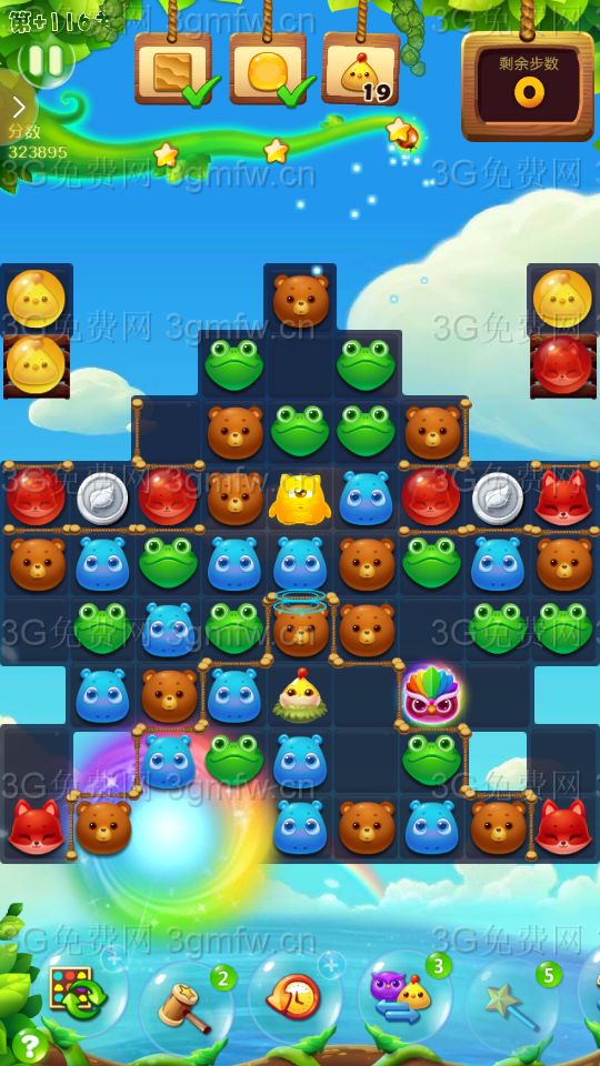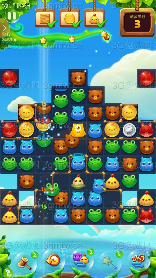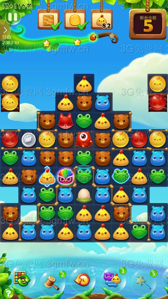 大眼仔移出传送洞,可以出现连消!充分的利用大眼仔,多组鸟加特效,鸟单吸,激活鸡窝并激活蜂蜜罐!三星主要靠走下面,多次大连消上分!还要注意蜂蜜和小鸡的数量!中途用了个魔法棒!