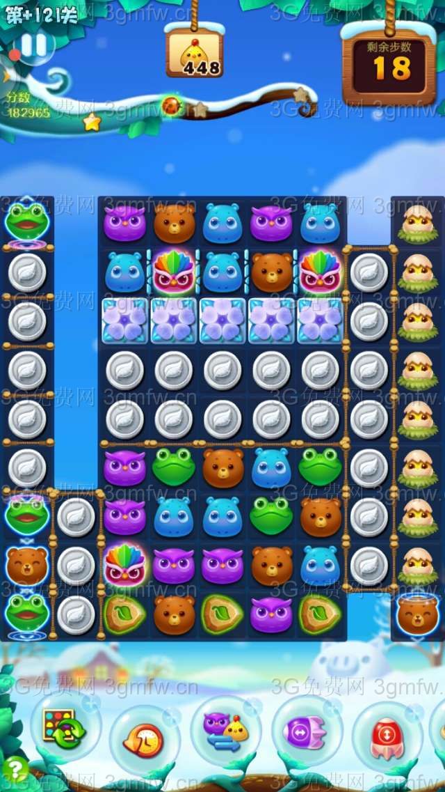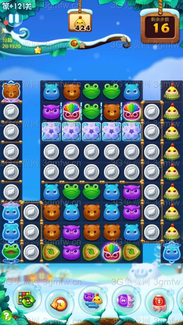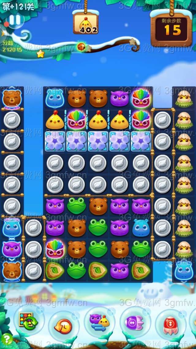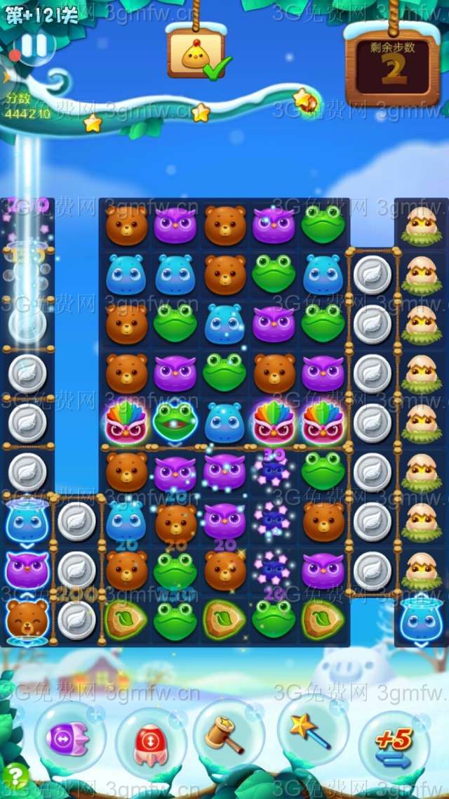 开心消消乐+121关卡补多一颗星星。暖春摘星自动加分百分之三十,就是12.3万多,买+3步。这关过关不难,就是分数很难爆涨,差两万多分就到3星。开始右下角打魔法石,魔法石消除旁边的一块雪块,左边的竖直特效掉落在右下角一排鸡蛋下面。爆打魔法石,竖直向上特效不断爆打鸡蛋,鸡蛋爆开出现一群小黄鸡自动组成魔力鸟在顶部,和下面的魔力鸟形成双魔力鸟,互换双魔力鸟清屏消除,左上角的白雪块消除,出现竖直特效。不断打底部的魔法石,右下角底部的竖直特效不断爆打鸡蛋,一群小黄鸡出现自动组成双魔力鸟。这时分数已经3星,再组魔力鸟和直线特效消除两三次,过关了。