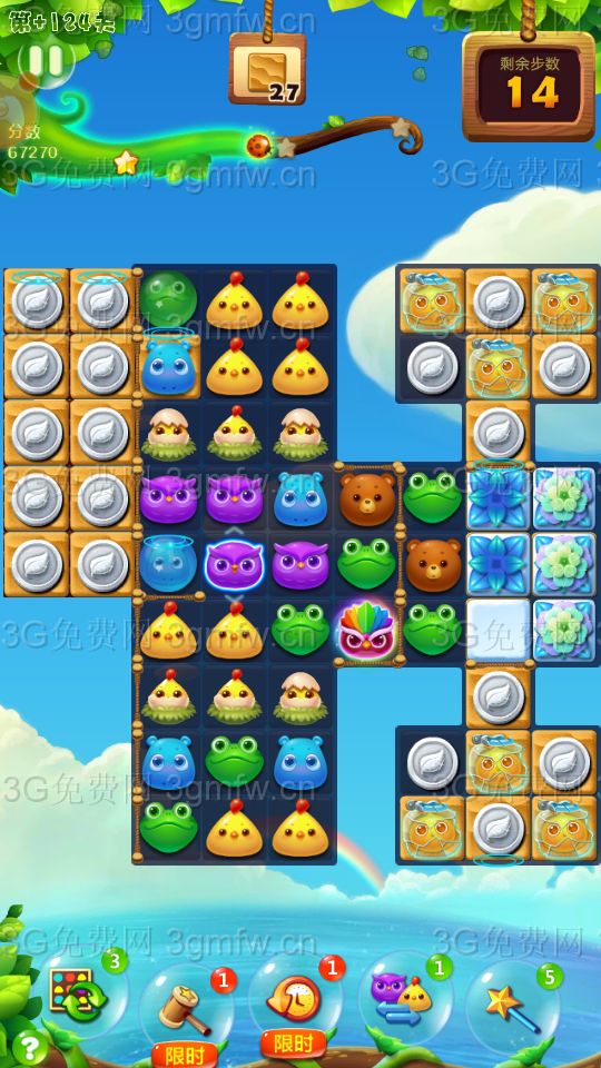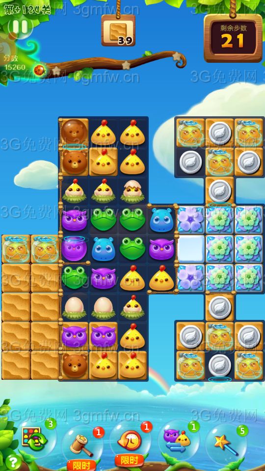 本关主要三消或组特效打鸡窝,让鸡窝连暴,飞出小黄鸡,生成特效,消除右侧的冰块,扩大空间!再组成鸟单吸小黄鸡,消除精灵罐,打开上下通道!