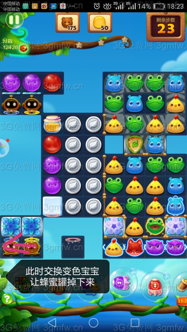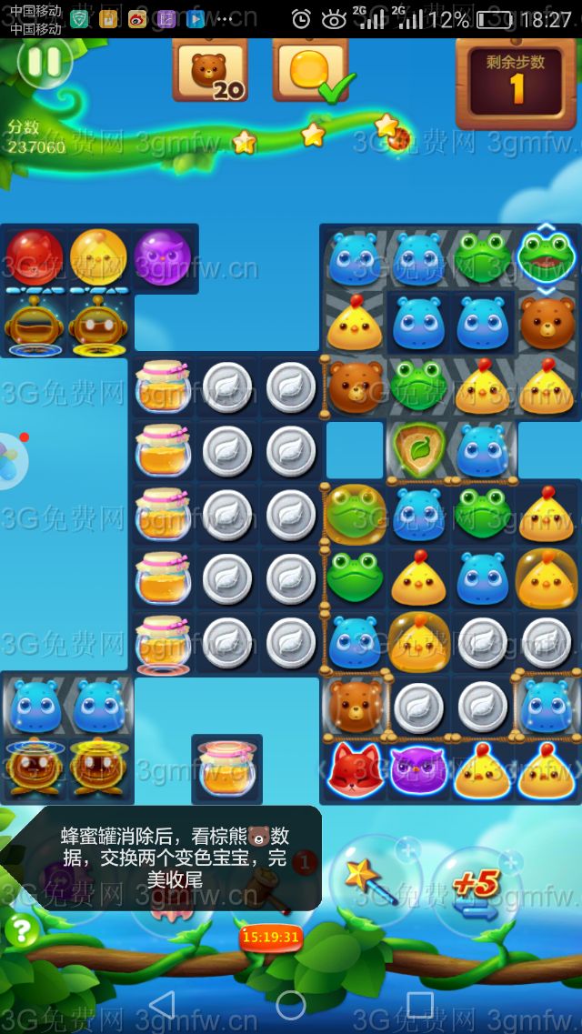 打右边磨法石快速下底,利用右下角特效炸左下角冰块,露出变色宝宝,交换右下角特效,激活变色宝宝后马上交换,让蜂蜜罐下落,继续打右下角特效,激活后不能交换,应该变色宝宝单吸旁边动物,这样可以不打断绳索,棕熊继续掉,同时也可以连消打蜂蜜罐,等蜂蜜收集好,再交换两个变色宝宝收尾。