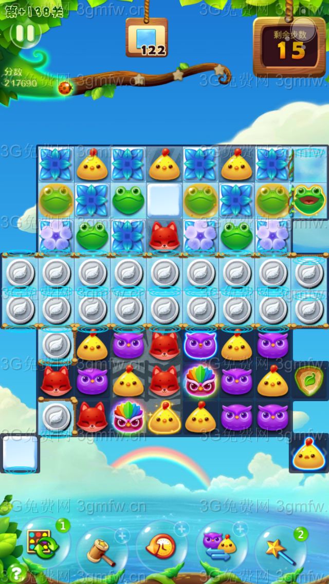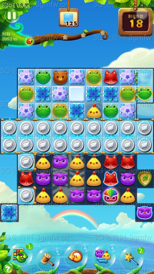 开心消消乐+138关第一步,首先清理下方左右两侧的雪块,尤其是左侧珊栏里的雪块,银币填充;第二步,下方空间打开后,近可能组鸟加特效或组合特效,实在没有,要快速近可能的消除银币(银币数量有限);第三步,银币消除后空间大开,多组鸟加特效(这时比较容易),很容易引起连消爆分,直到结束。三星上分重点在于第三步的鸟加特效后的连消爆分。本人用银币买前置加三,组了多次鸟加特效并引发连消,余八步顺利三星通过。