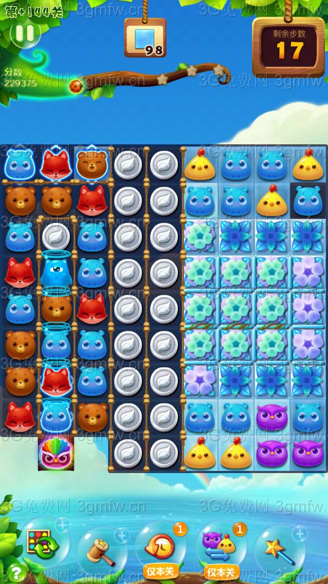 这关主要是把中间的小鬼往上挪,出现双鸟,一起消除。