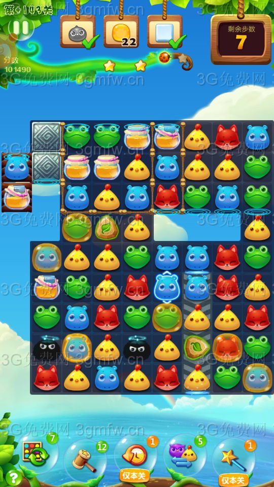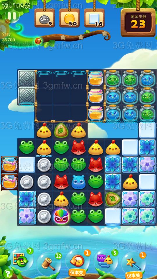 利用魔法石,快速消除冰块,激活蜂蜜罐!让画面上下流动,产生连消上分!最后一步,用了送的魔法棒,组成鸟加直线特效,完成任务!