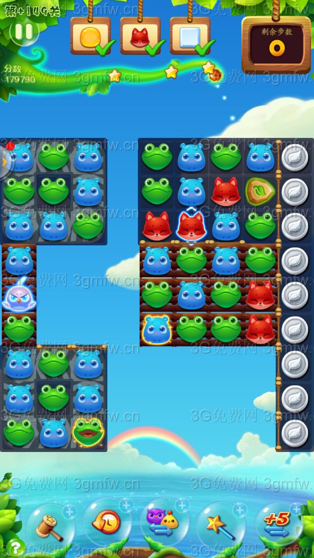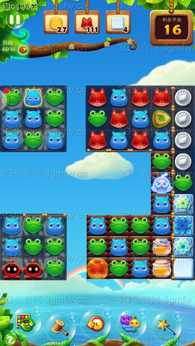 开局加3步,消闪电鸟下方雪块,让其掉落至第五格,等左右移动的小梯子过来时使用强制交换,并用小木槌敲闪电鸟,这样它左移消灭下方小动物会掉下充能宝宝,右移消灭下方小动物掉落蜂蜜。就能顺利过关了!