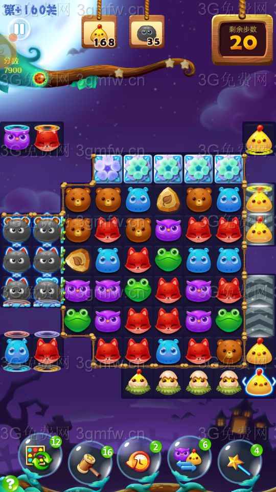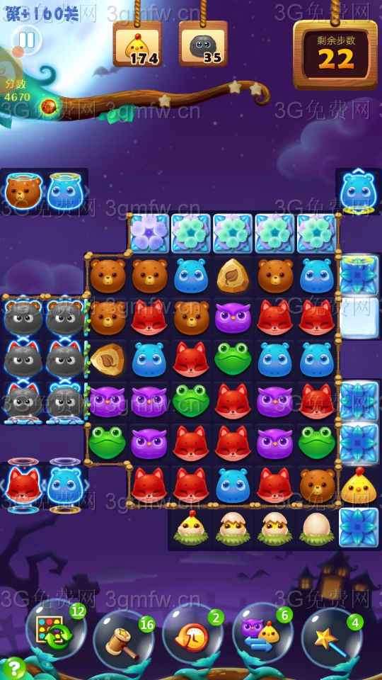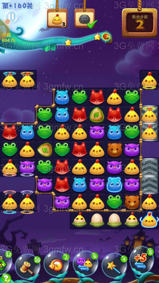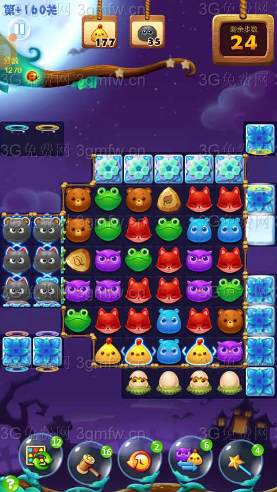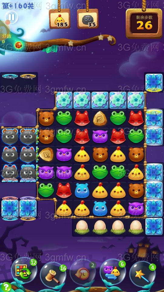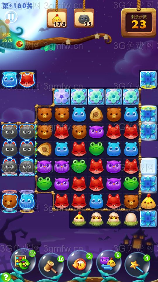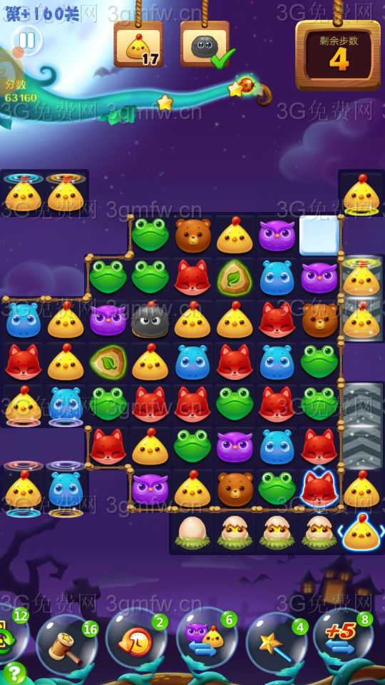 5.主打鸡窝,兼右侧小鸡自消,让四个鸡窝连暴,带动魔法石消除冰块和灰毛球!