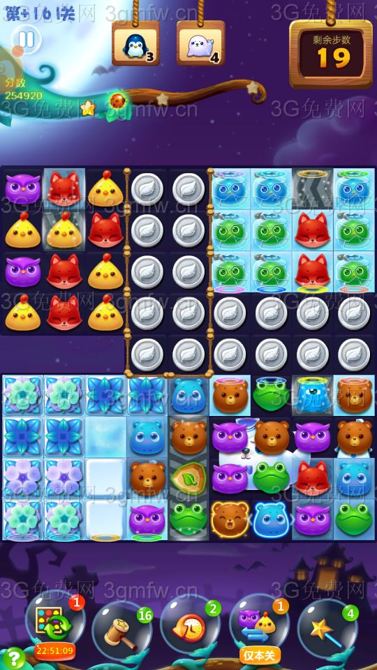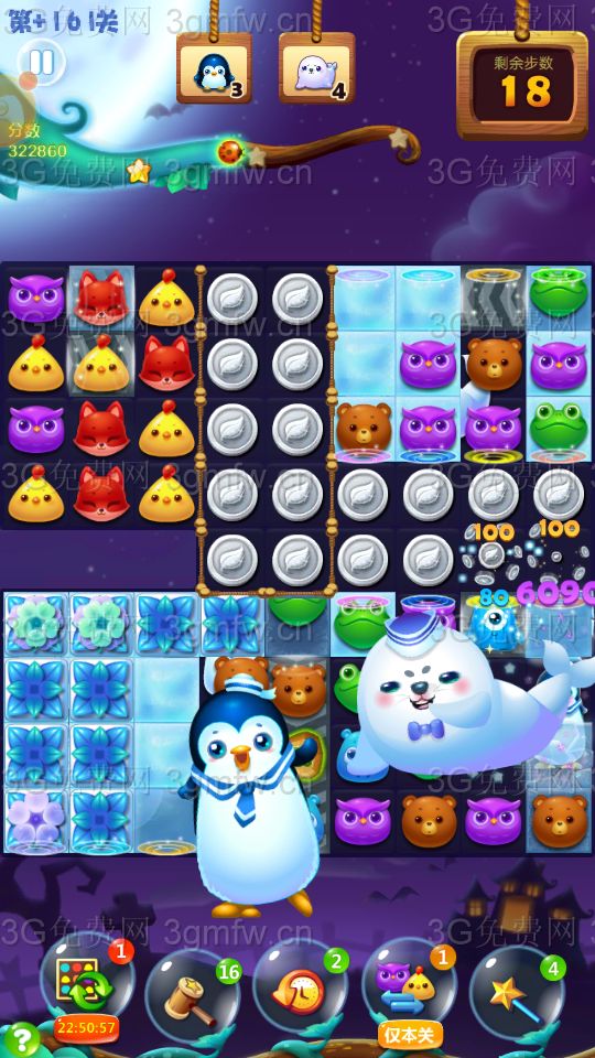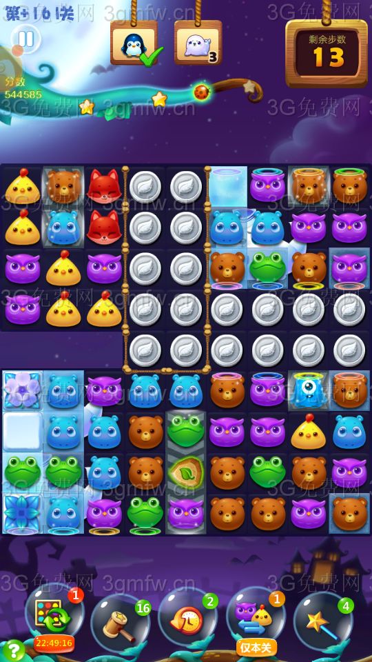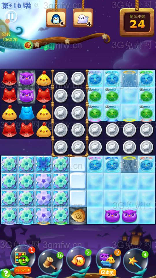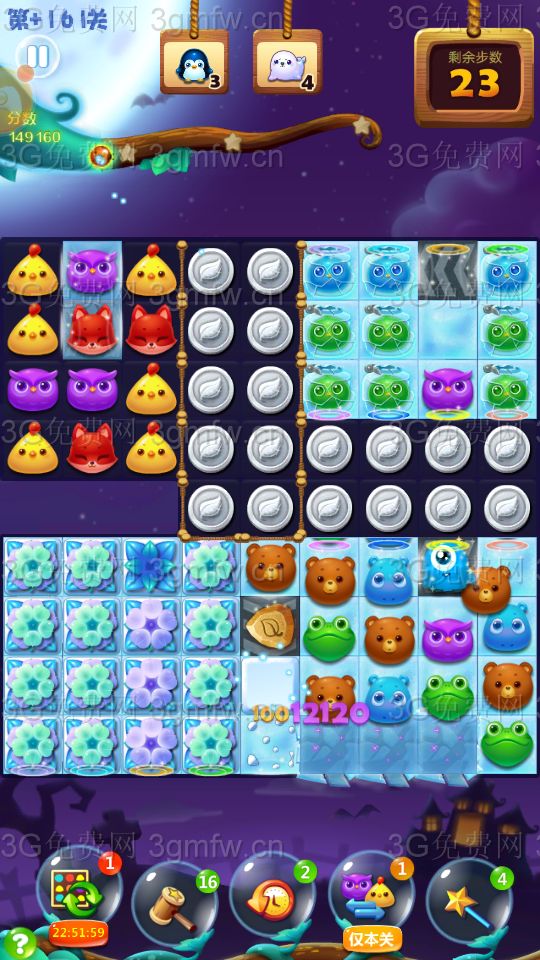点亮魔法石,底部利用横加爆炸特效,快速向左消除冰块,打开传送口,动物下落右上面,打暴精灵罐!