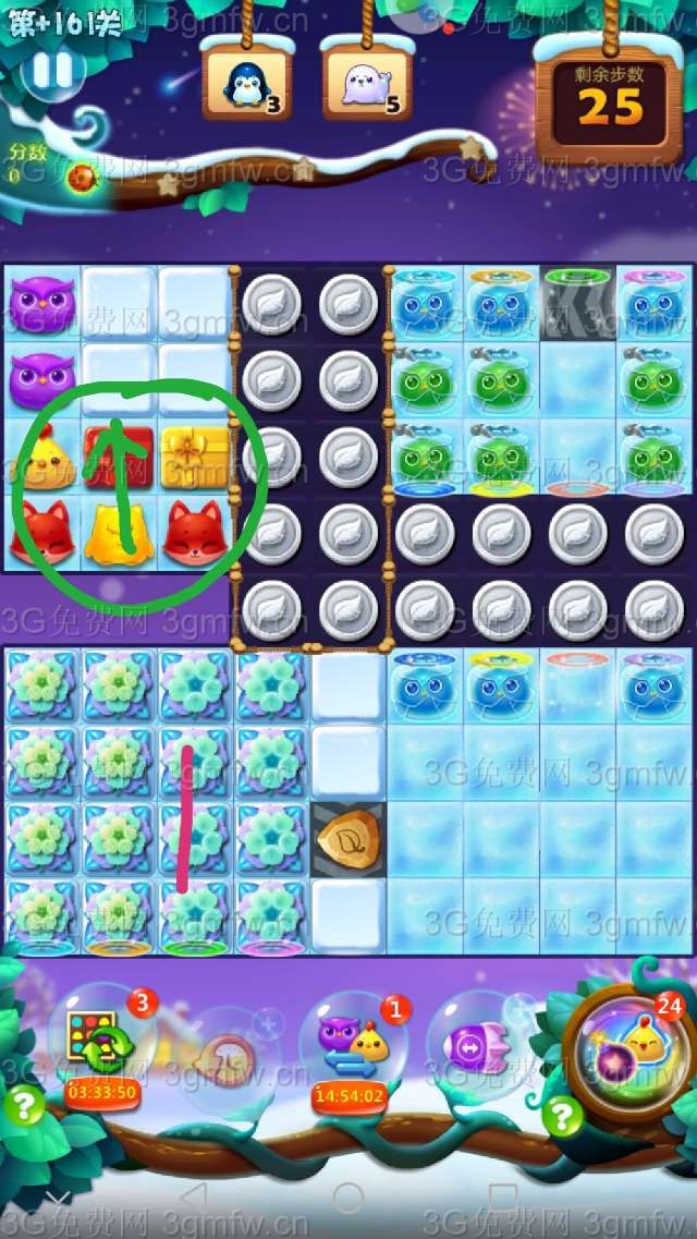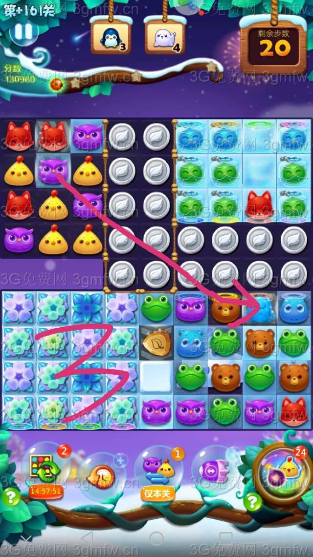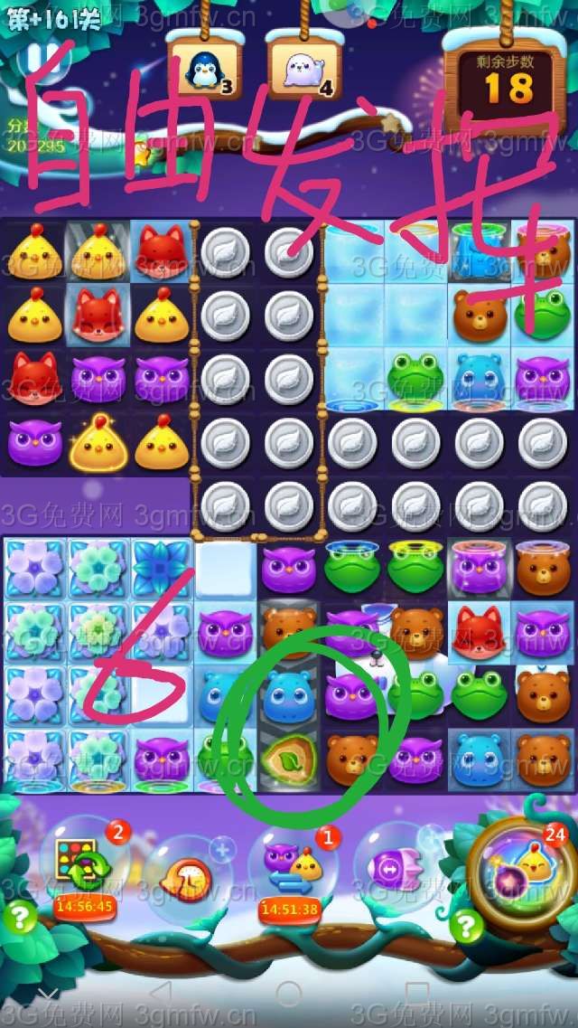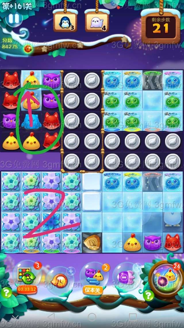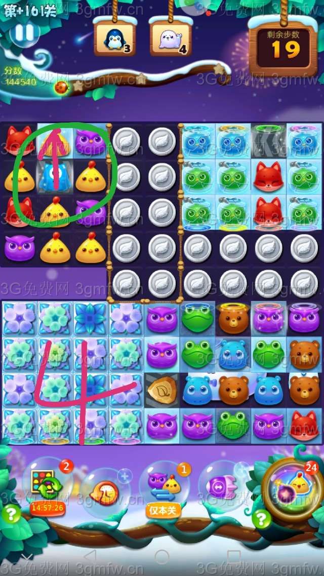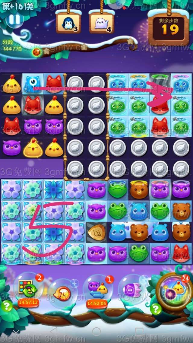 本关较难,建议+3步,把周赛的爆炸特效刷新锤子等用上,事半功倍。祝大家顺利通关!