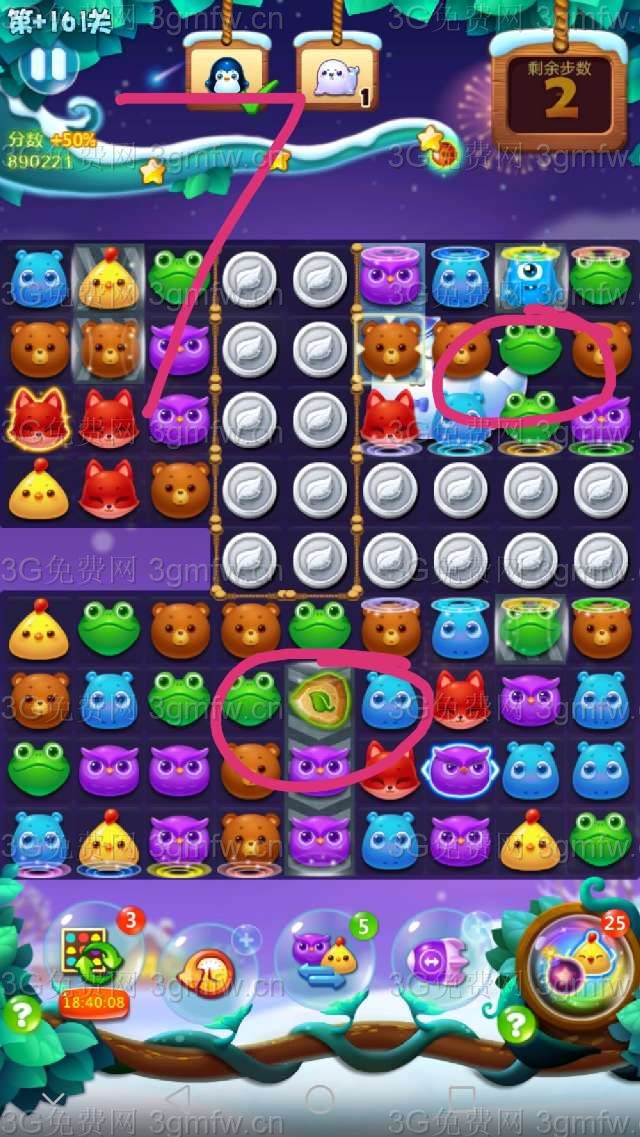 第七步,本关三星爆分点在右上角红圈部分,主攻右上角和魔法石,小动物连续自由下落爆分给力,如图7,最后通关。