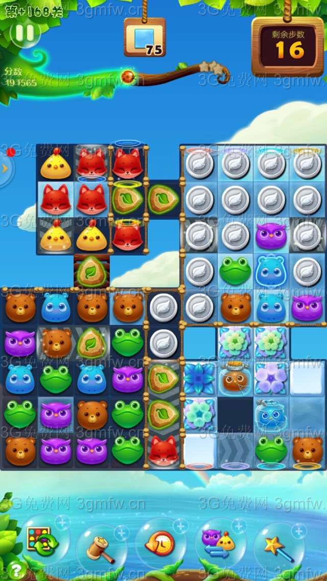 开心消消乐+168关不买+3步,建议周赛关卡免费赠送的直线特效和爆炸特效道具使用上。开始移动青蛙往左边,得到一只魔力鸟。魔力鸟单吸红狐狸,一片红狐狸释放出来。这时出现有横向特效和爆炸特效,互换后右下角的萌豆爆炸,雪块也减薄。在左下角激发魔法石,魔法石消除雪块,右下角的空间扩大后,组竖直向上特效消除右上角的雪块。出现连消后,雪块很容易消除完,3星过关剩下有几步。