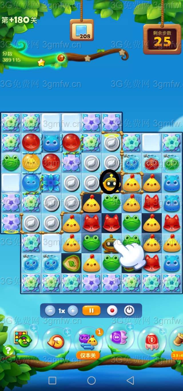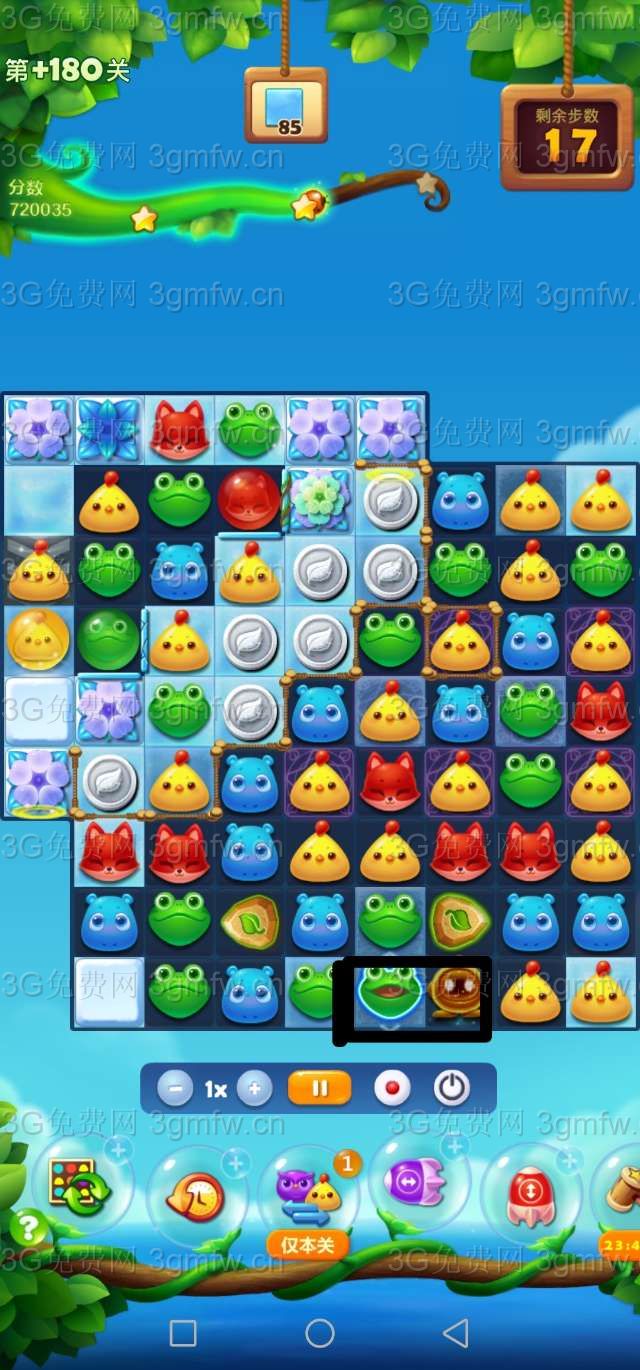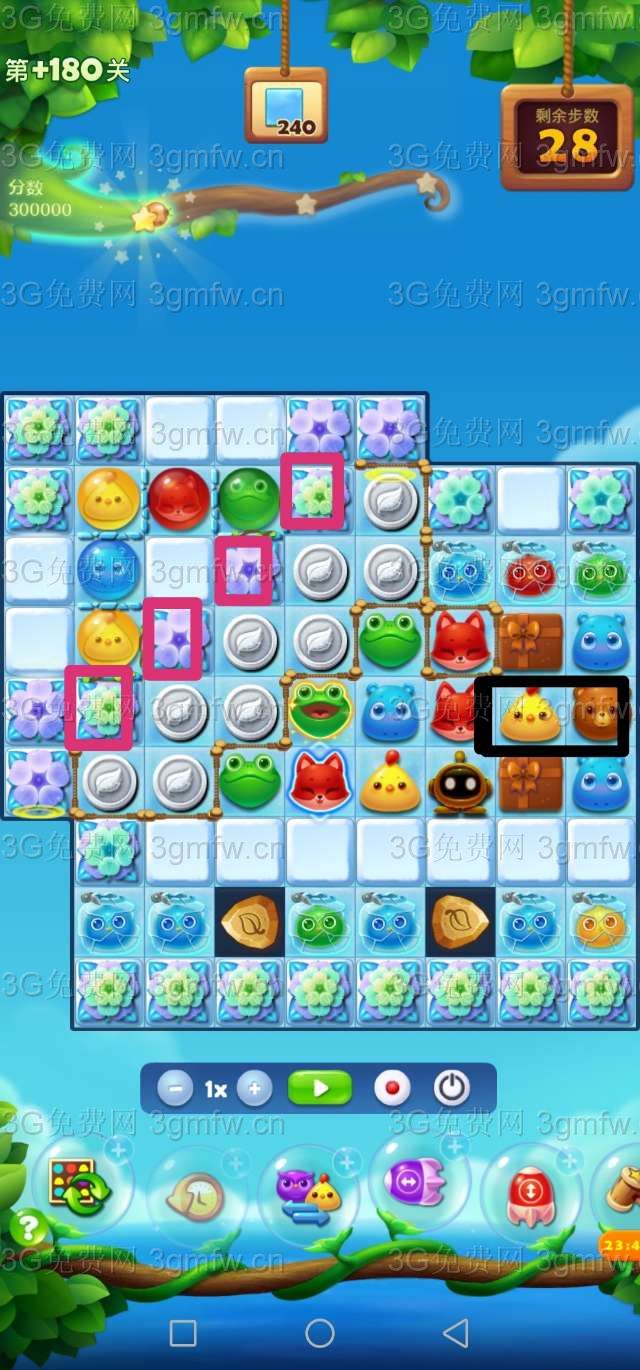 开始先拿到道具。本关消除的重点在右上方那几个雪块。只有雪块消除了,银币才不会掉落。还有一个魔法阵,最后注意一下有没有落下冰块。等魔法阵第一次转过来,用道具将小黄鸡染色宝宝交换出来。我没有机会染色宝宝交换。让染色宝宝交换特效,放大招也行。买上前置+3,步子特别的不够用。