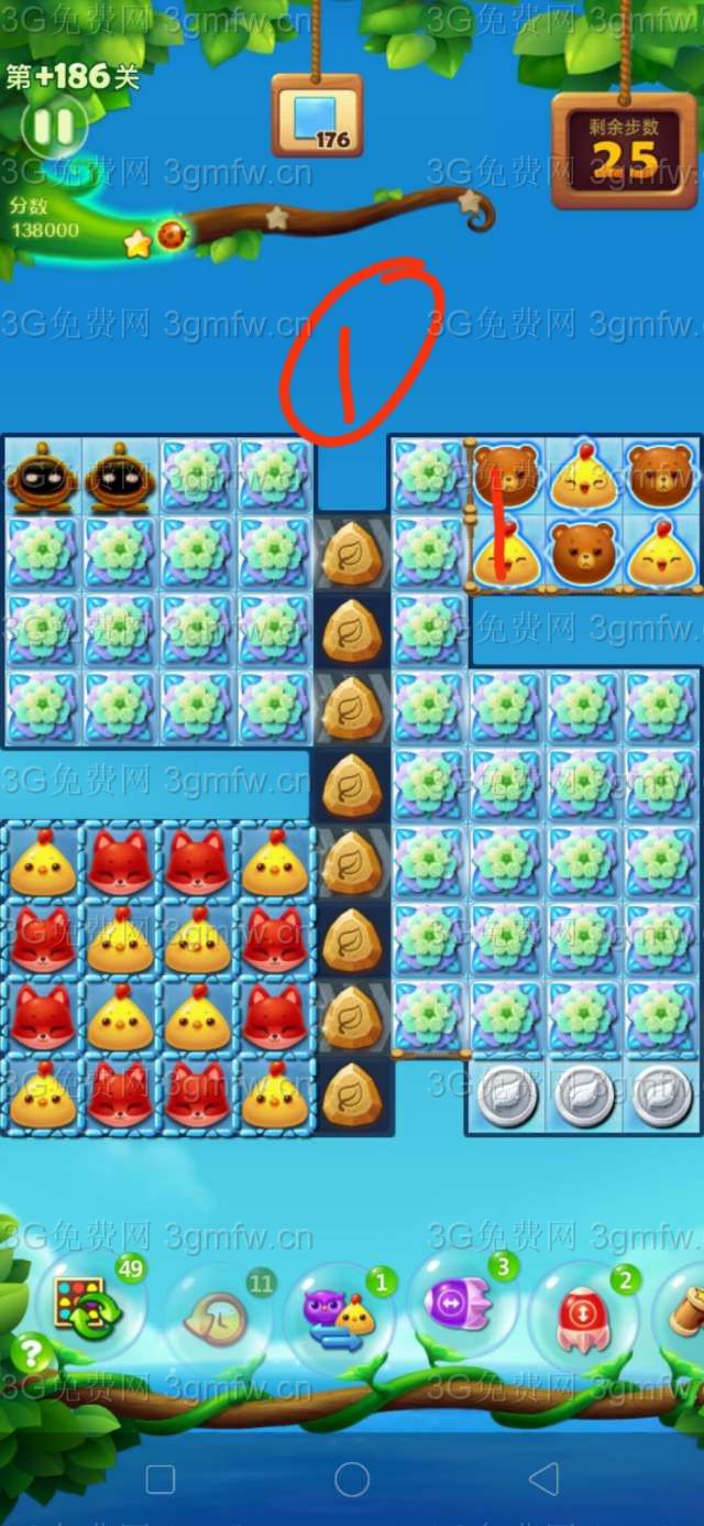 本关后期收尾步数紧张,建议开局加三!如图一,第一步固定!第二步,不要直接交换两个宝宝,右下角打魔法石一步,第三步,当魔法石在一条线上时,交换两个宝宝!后面就自由发挥了!左上角,下面4块冰容易烂尾,或右上角,重点注意!