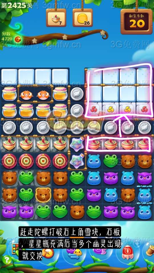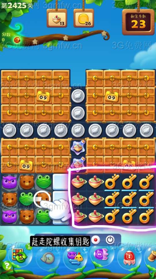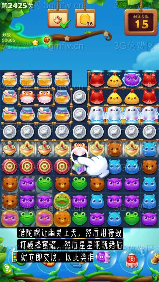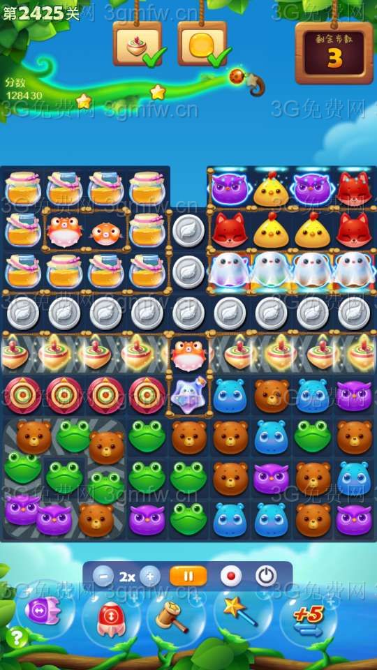 开心消消乐第2425关怎么打?开心消消乐是消除Q萌可爱的小动物们,将三个及以上相同颜色的小动物连成一条直线即可消除,老少皆宜!不会闯关的玩家快来看看G7小编带来的第2425关攻略吧!