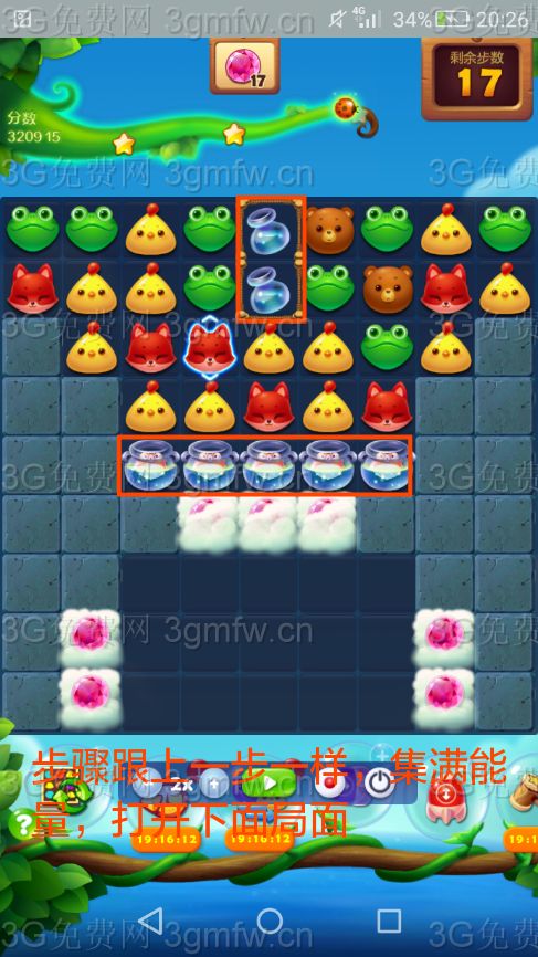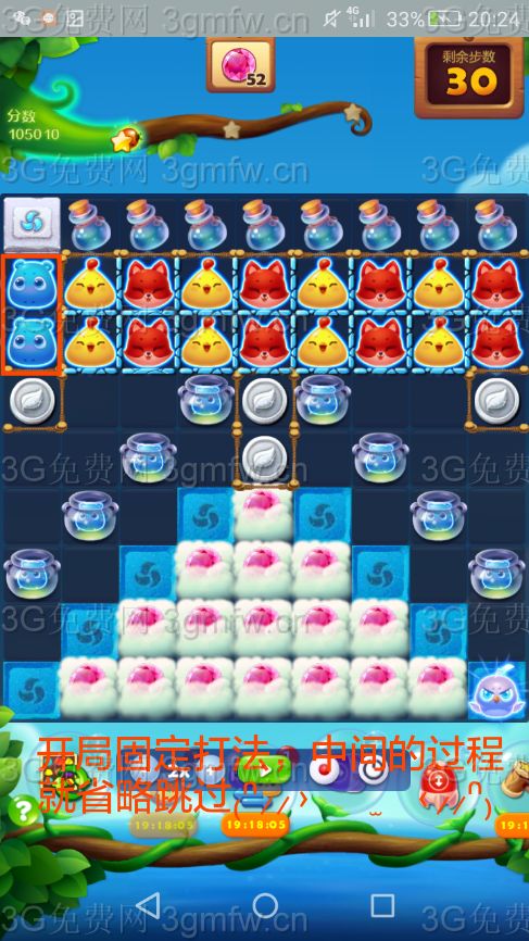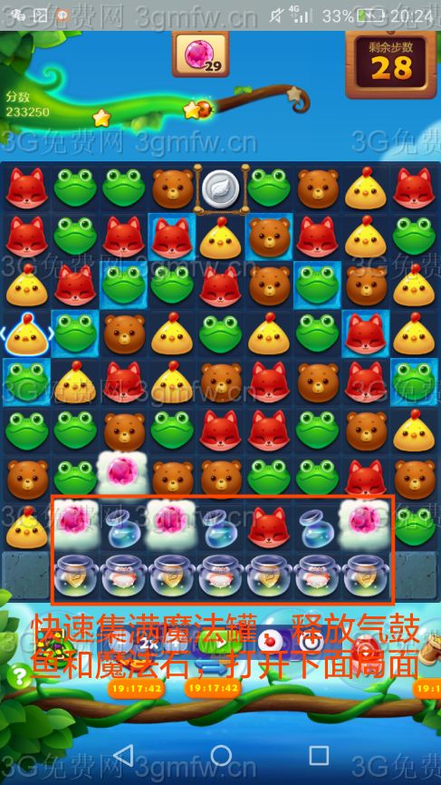 难得一次宝石关,让我迅速通过,固定开局,左上方两个动物交换,特效消除第一面通过,然后魔法药水收集,充满魔法瓶,释放魔法瓶,通过第二面,然后气鼓鱼,魔法石,魔法药水,魔法瓶,一起帮忙收集宝石,步数有点小紧张,祝福好运。