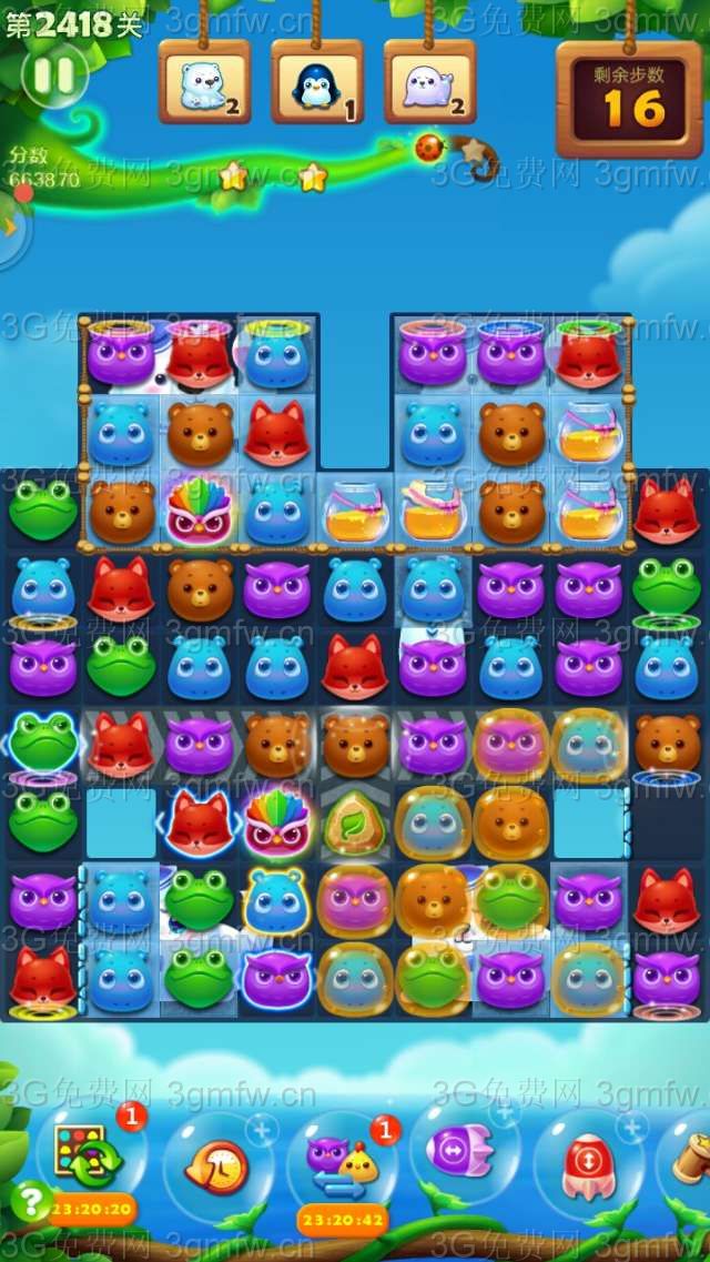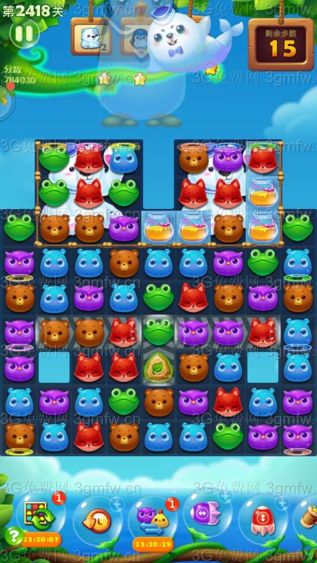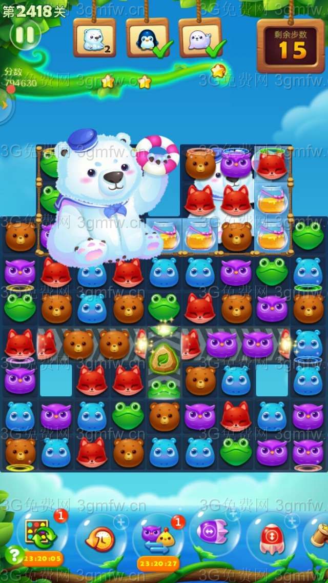 开心消消乐第2418关卡补多一颗星星。集星寻宝加分百分之三十,买+3步。这关上面有大量蜂蜜罐出现,尽可能组魔力鸟和直线特效互换,当蜂蜜出现一大片,激活魔法石即可消除很多蜂蜜。清理完蜂蜜后,上面的两只大雪熊就很容易收集到了。最后一只雪熊,居然剩下有15步。3星过关了。