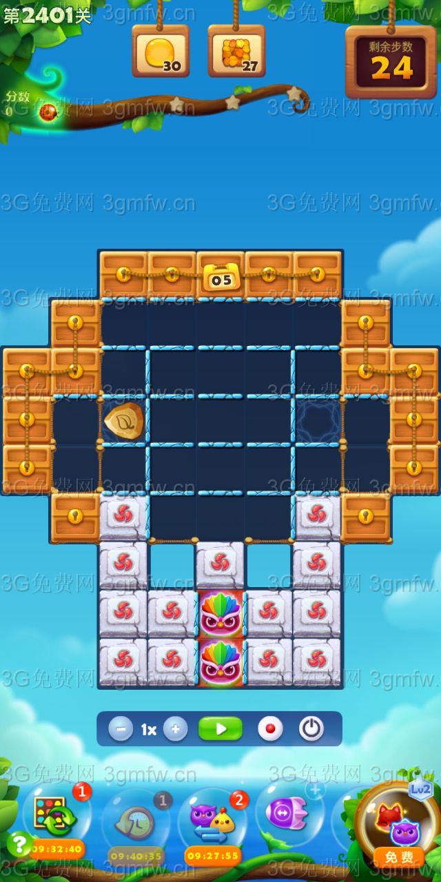 树叶不难消,难在收蜂蜜,需打破所有蜜罐才能收齐。以打上魔法石为主,没好的步数可打下魔法石打开局面。钥匙打破最上面树叶才出现,更新后第一关不难,裸打过关。
