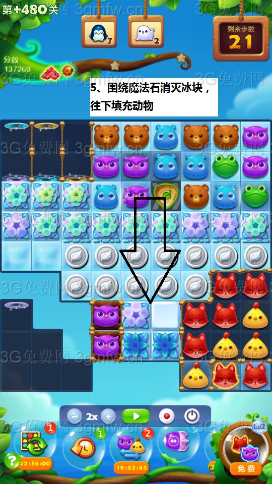 【连续消除】:连续消除得分:一般消除一下30分,连消每次+30,60、90、120依次叠加;冰块里面消除一次1000,连消一次+1000,2000、3000、4000依次叠加;5+4组合一下给2000,每个被变化动物200分,每打掉一个普通的动物15分,冰块1500。