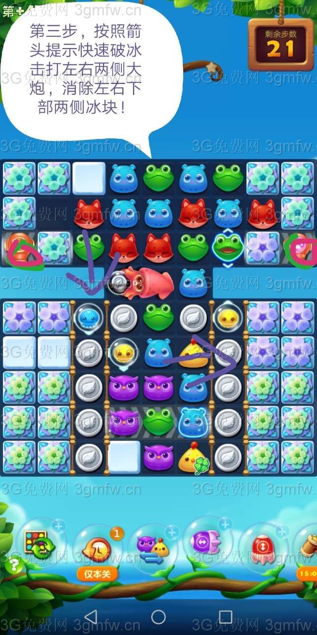 【连续消除】:连续消除得分:一般消除一下30分,连消每次+30,60、90、120依次叠加;冰块里面消除一次1000,连消一次+1000,2000、3000、4000依次叠加;5+4组合一下给2000,每个被变化动物200分,每打掉一个普通的动物15分,冰块1500。