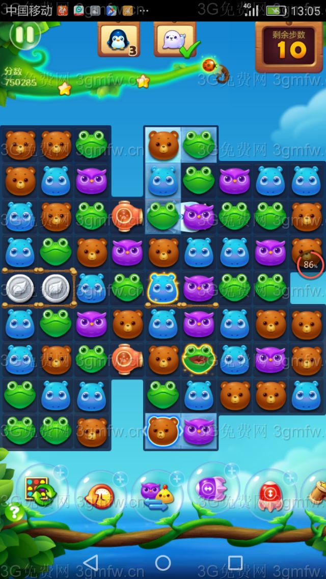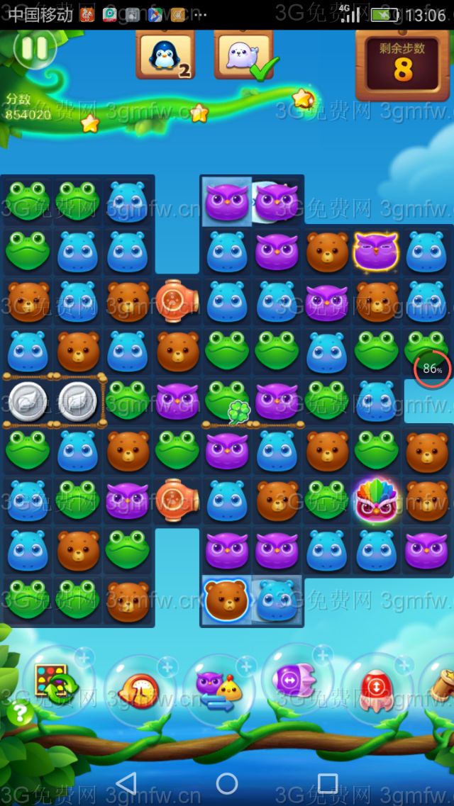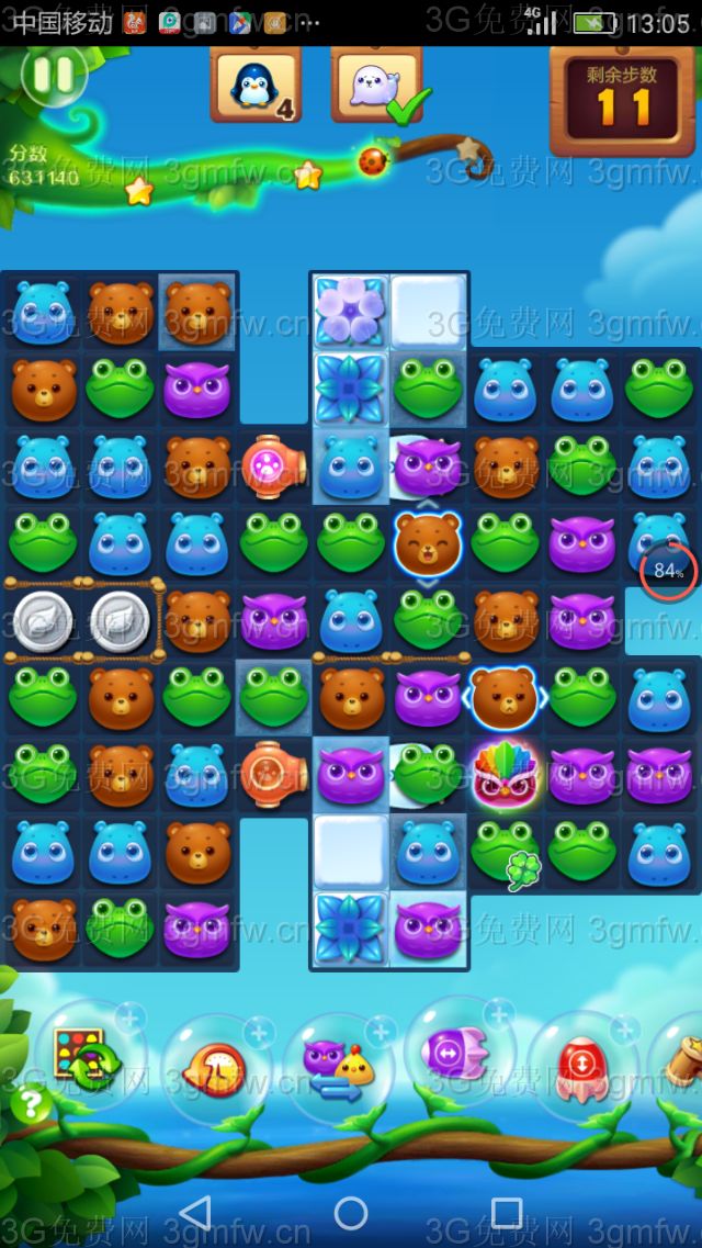 后期同样利用三消和合成特效解救小动物,该关有四色动物参与,魔力鸟特效易合成,整体难度较低。
