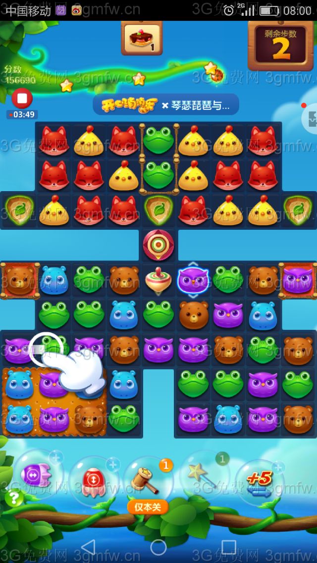 2378关,我用了一个开局魔力鸟,开局导弹,开局加3,开局两特效,两个重新排列,一个魔法棒,一个锤子 ,一个加2才三星过关。最后一步点了一个魔法棒,还差点就用了一个加2,不容易啊!一点小建议就是:下面局面打开后,既消冰块又消陀螺优先,尽量制造54。
