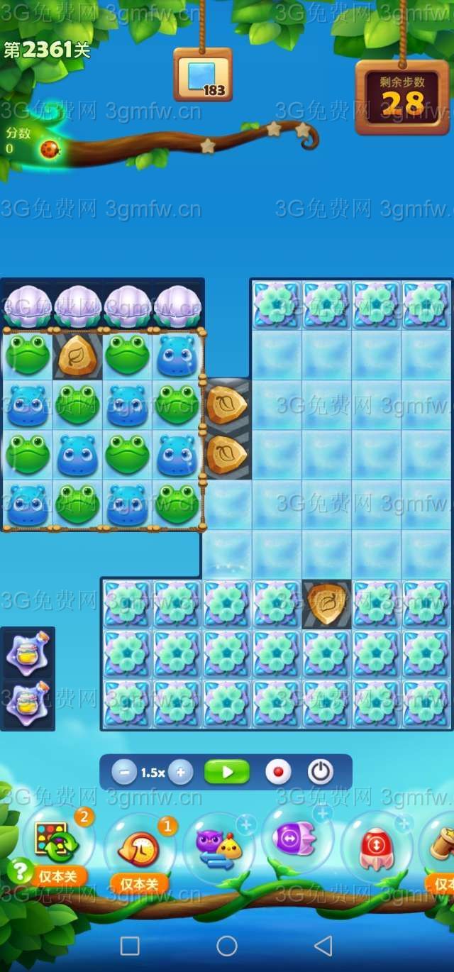 开始激活魔法石和水母。然后将右上面的雪块消除,小动物们和蜜罐下落。有两个星星瓶靠收集蜂蜜激活。激活向下的魔法石,一边解开蜜罐,一边向下。然后星星瓶交换。格局打开了。多利用横向特效发大招。