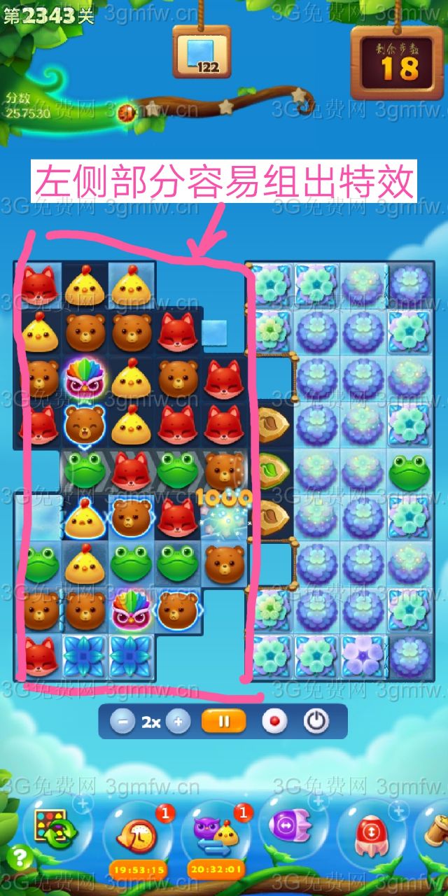 本关左侧部分容易组出特效,击打树叶的时候不要忘了多组特效哦。