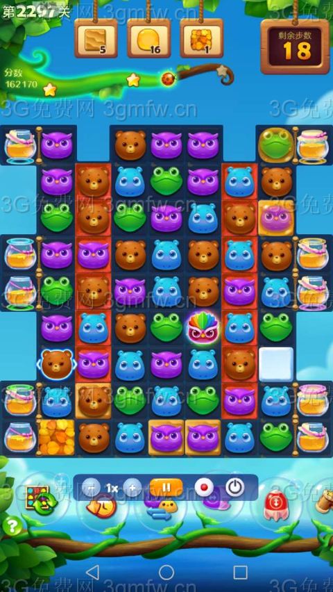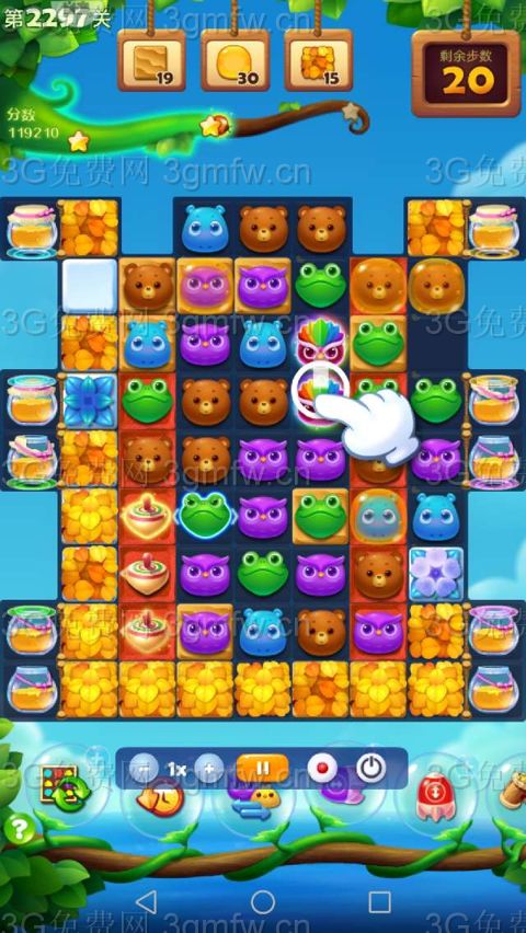 固定开局两步,剥掉陀螺的外衣,发现她旁边有个小光标箭头,然后撞两下按箭头飞了,此关也不难,没银币有精力的就不要加步了,比如我,唯一难点是胸大熊二喜欢吃的……蜂蜜!特效挺多。