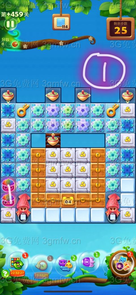第四步,完成前三步你就会看到各种连接爆炸并自动消除钥匙了。剩下的没陷阱,各有各的打法,干掉陀螺冰块,自由发挥,大家加油哦~