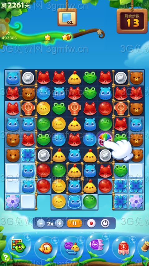 多打大炮,最好消一次两个大炮都能轰,大面积消冰,多组两次最底一层的横向特效,我组成三次,加上一次魔力鸟加直线,才好不容易最后两步过,主要还是运气。